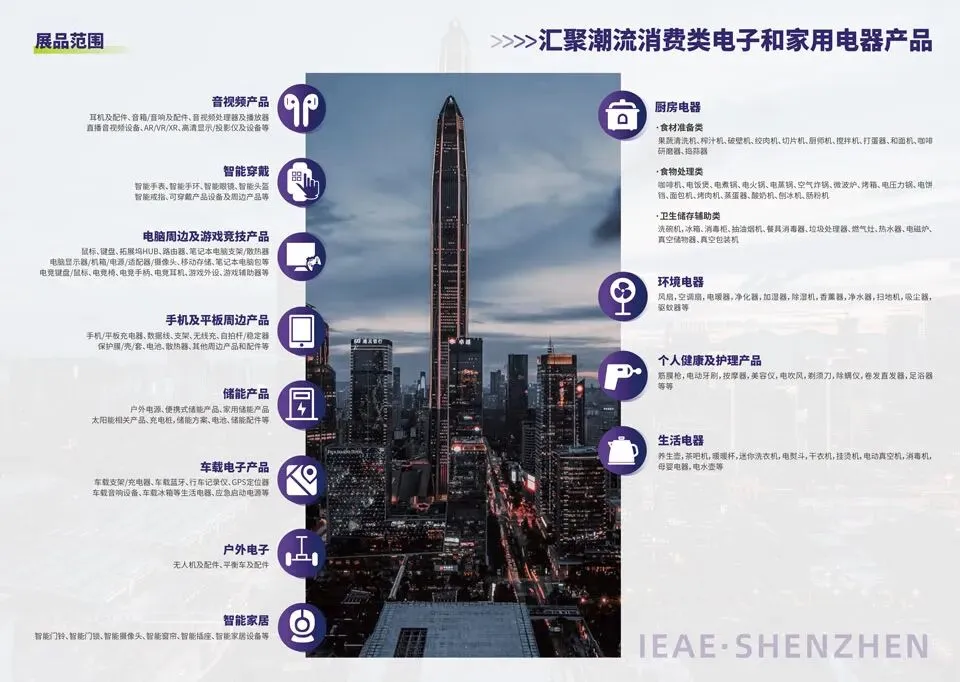 IEAE深圳电子展深耕电子电器领域,深入细分产品赛道,共涵盖音视频产品、智能穿戴、电脑及游戏竞技产品、手机及平板周边产品、储能产品、车载电子产品、户外电子、智能家居、厨房电器、环境电器、个人健康及护理产品、生活电器十二大展品范围,为企业和买家构建了一个高度精准、专业高效的对接平台。