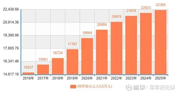 如果仅统计65岁以上人口,国家统计局有更权威的数据,如下图,10年间从2016年的1.50亿人口增长到2025年的2.24亿人口,10年增长48.7%(年化+4%)。