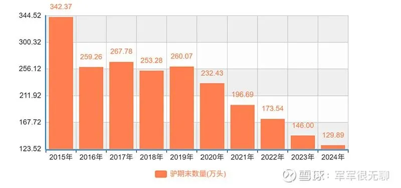 上图摘自于国家统计局,从2015年至2024年,10年间,驴的数量从342.37万头,降至128.89万头,年化减少10%。由于役用场景的减少,毛驴数量在未来会不可逆的下降。