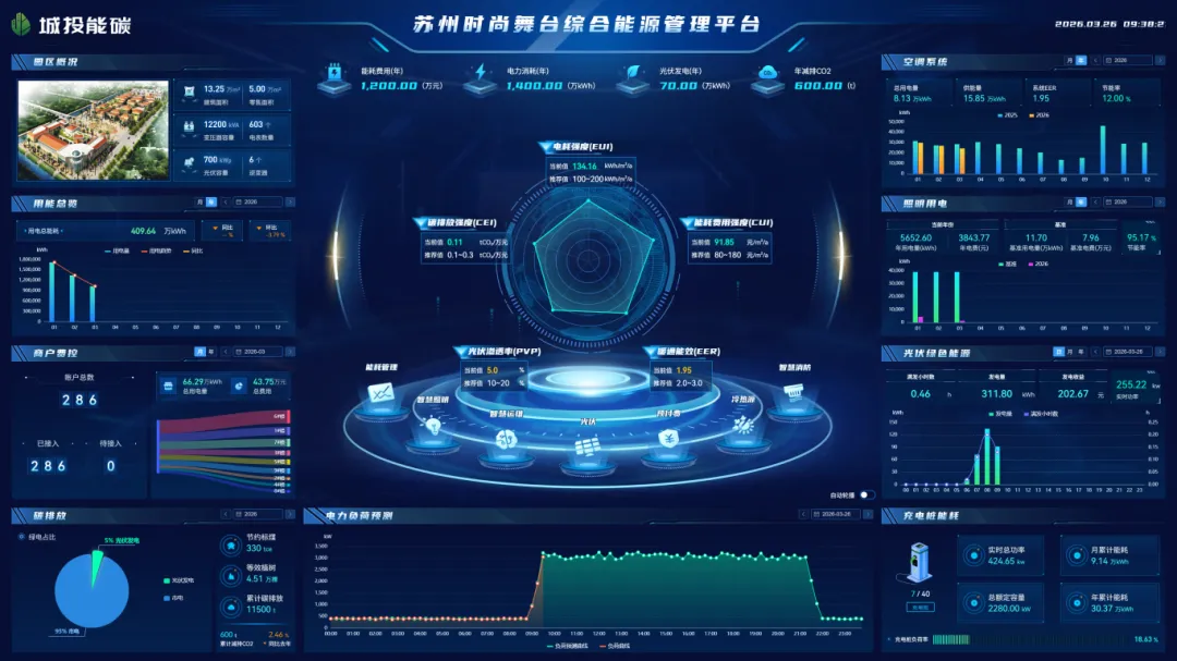 苏州时尚舞台位于苏州工业园区,于2009年11月27日开业,建筑面积10万平方米。苏州城投能碳科技发展有限公司于2024年11月对时尚舞台的空调、照明、电表等系统改造,实施智慧能源管理,照明系统用电量从原46.8万kWh/年降至10.83万kWh/年,电费由31.82万/年降至7.37万元/年,节能率达76.86%。