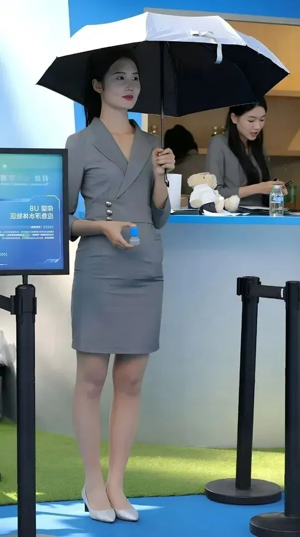 首先来看这位低马尾女生。她穿着一件灰色的西装套裙,既合适又符合要求,深V领的设计使脖颈显长、腰部宽阔却不失优雅的系带把她身上的曲线包扎起来。脚上的米白色细高跟和浅肤色的丝袜搭配起来,整个身姿又高又瘦。她手上的黑色遮阳伞给整个配饰组添加了一种灵动之感。站在那里就是一种自信的美。