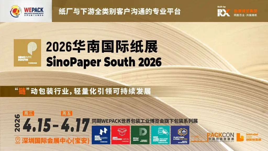 2026年4月15日至17日,作为WEPACK世界包装工业博览会旗下系列展之一的2026华南国际纸展,将于深圳国际会展中心(宝安)举办。作为透视全球包装行业发展格局、洞见行业新趋势的业界盛会,本届展会将汇聚全球纸张供应商,全面展示包装用纸、文化印刷用纸、特种纸及特种纸板,打造纸厂、经销商与下游用纸企业、设计公司高效沟通的专业商贸平台,极大丰富采购渠道,有效降低生产成本。