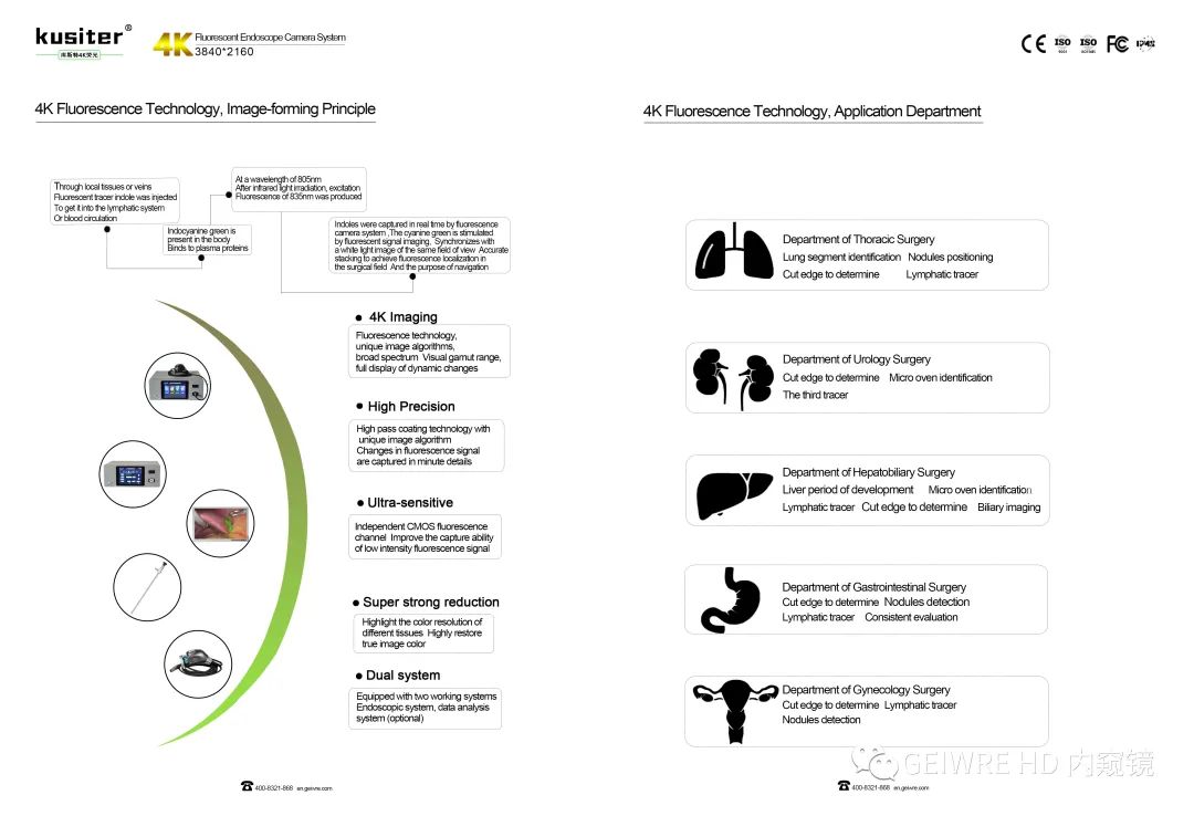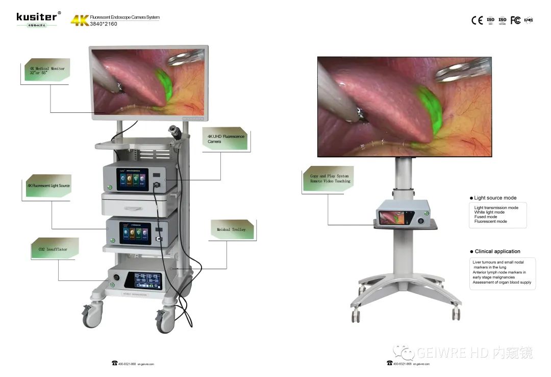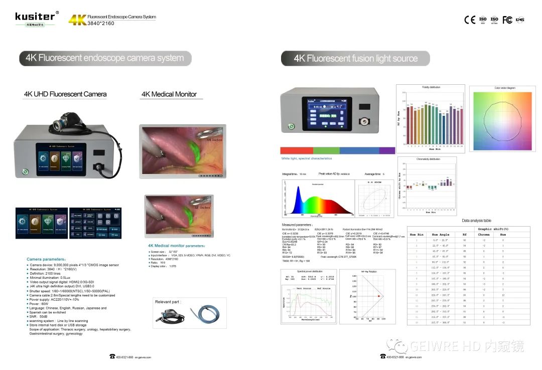 荧光应用于手术的真正意义就是精准显示癌变位置,满足医生精准的切除的目的,起到真正的术中引导显示作用,术后的完美切除的确认。真正的荧光好的效果是:4k白光成像效果整体通透,边缘不暗,立体感强,远近都清晰,景深更长,荧光效果呈现远近颜色一致,不会出现远近荧光区域大小的现象,融合显示的时候自然无病变区域色彩还原真实,清晰度高,荧光边缘处显示明显,不混沌。不会出现忽明忽暗的现象,荧光模式下成像稳定,荧光不会自动消失或者显示,接高频功率机器时候不闪屏,不黑屏。