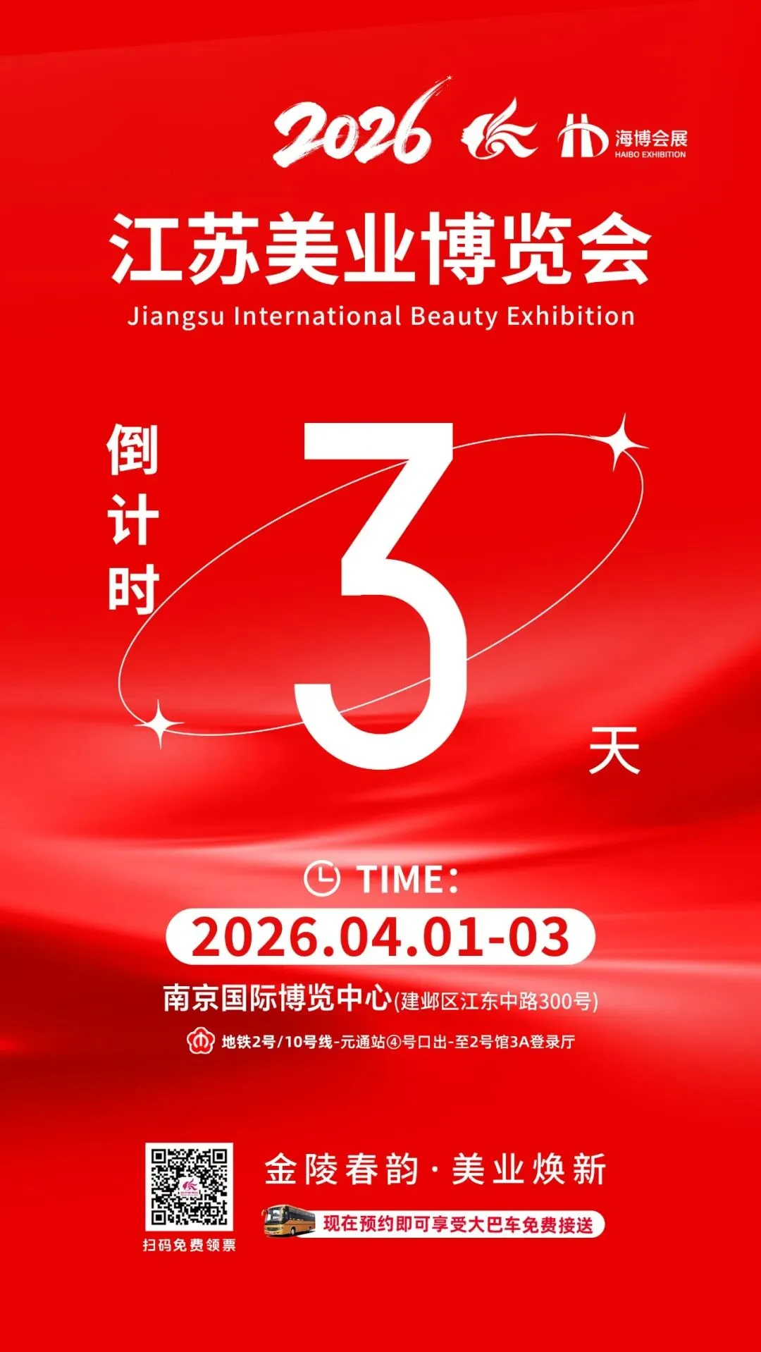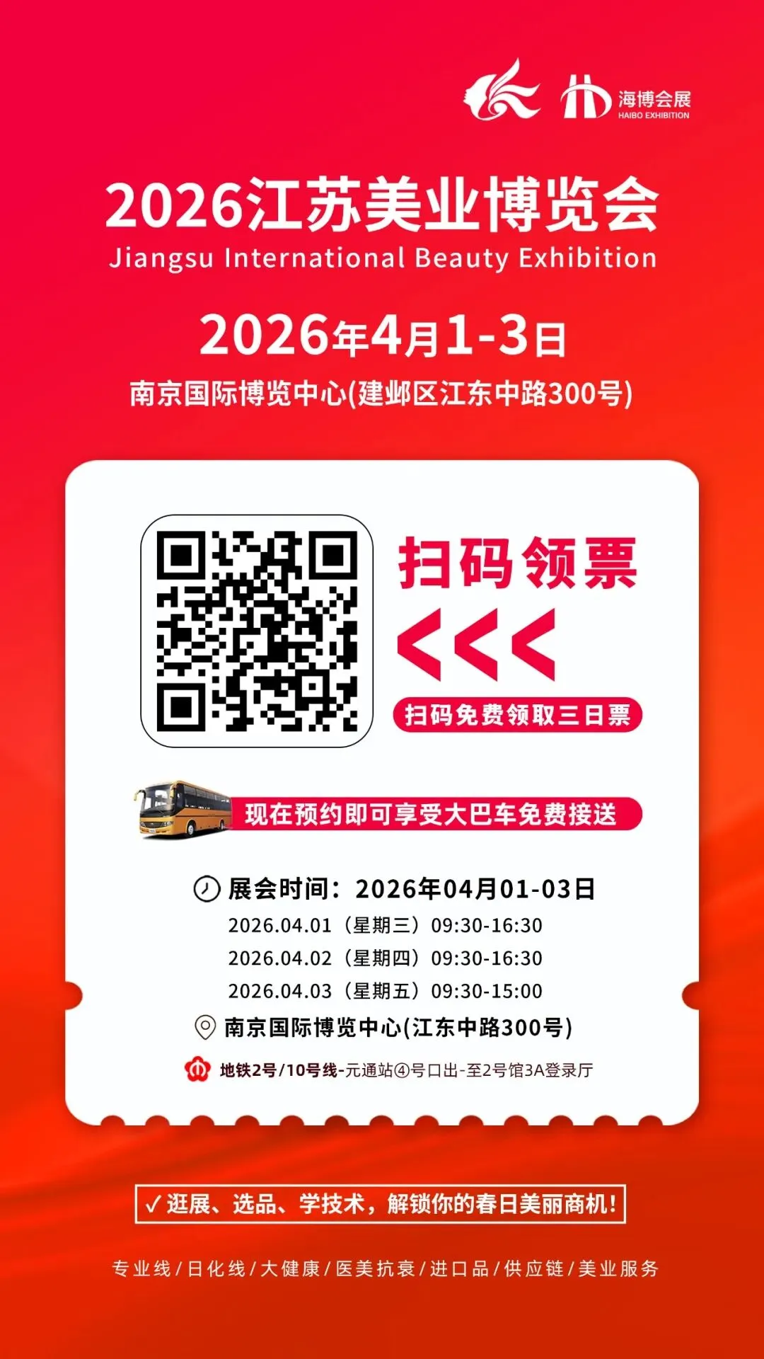 2026年4月1-3日,2026江苏美业博览会将在南京国际博览中心河西CBD启幕!展会以“金陵春韵 · 美业焕新”为主题,涵盖专业线、日化线、美睫纹绣、医美、大健康养生、供应链等美业全品类,一切关于美的探索与发现,都将在这三天里以最耀眼的方式呈现,成为华东美业春季采购、技术升级的“一站式引擎”。
