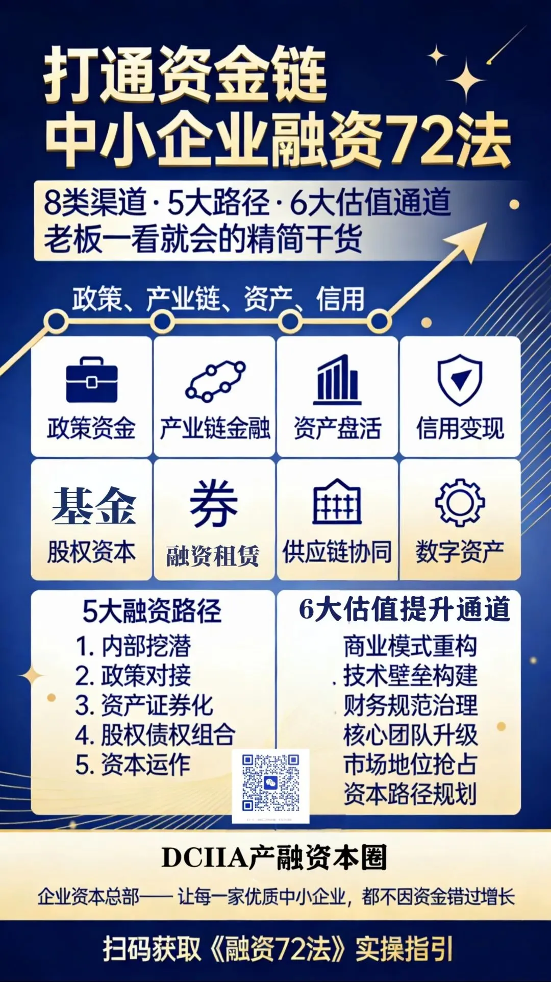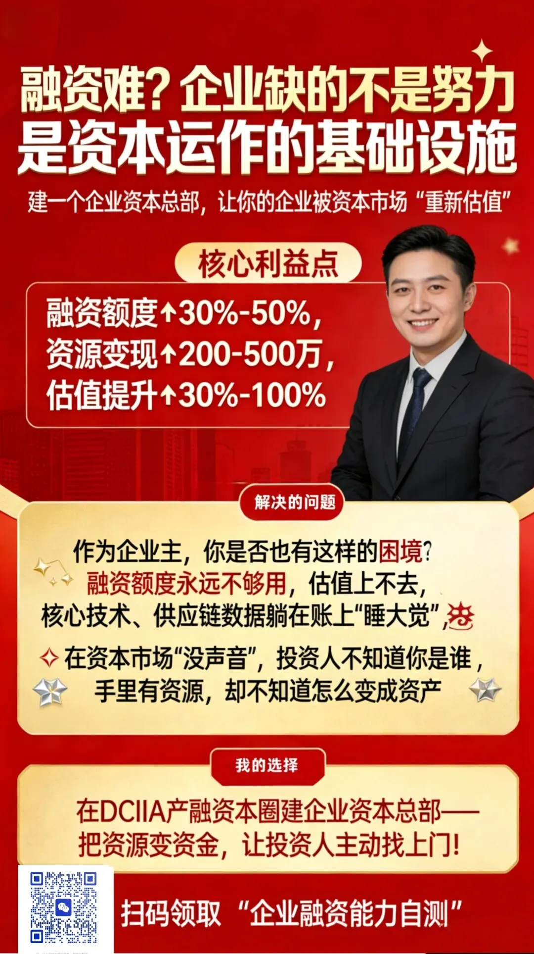 作为企业的“融资基础设施”,来DCIIA产融资本圈,建企业资本总部,妙用“融资72法”,为你拆解出最精华的企业实操框架。拒绝纸上谈兵,只搞老板一看就会的“钱规则”。