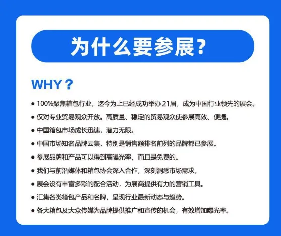 第22届上海国际箱包展览会作为全球三大专业箱包展之一,由上海市商务委员会批准,中国轻工工艺品进出口商会、上海市皮革技术协会、浙江省皮革行业协会联合主办,上海能博会展有限公司承办,是全球箱包制造商与经销商、品牌商、代理商、贸易商、电商、设计师、买手等对接交流的高端平台,聚焦箱包产业,汇聚行业产品、技术、信息、人脉,推动箱包内外贸发展新空间,打造箱包全产业链生态圈展会。