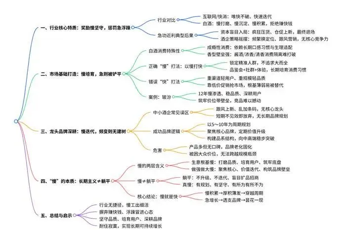 内容提要:本文剖析白酒行业“奖励慢、惩罚急”的核心特质,指出急功近利的资本和酒企多以失败告终,而坚守“慢”逻辑的企业方能长期发展。从市场基础打造、龙头品牌深耕、“慢”与躺平的区别三个维度,结合案例阐释“慢”的价值,强调白酒行业需沉心培育用户、深耕品牌,遵循行业规律,“慢”是长期主义的坚守,更是实现长期增长的关键。在充满不确定性的市场环境中,传统白酒行业始终保持着自身独有的发展节奏,它不似互联网行业那般追求“唯快不破”,也不似快消品行业那般依赖“快速迭代”,反而有着一个鲜明的行业特质——奖励“慢”的坚守,惩罚“急”的浮躁。很多初涉白酒行业的资本、投资者,或是部分急于求成的酒企,往往陷入“急功近利”的误区,总想快速收回投入、快速实现增长,可最终大多以失败告终;相反,那些沉下心来、循序渐进,遵循行业规律稳步前行的酒企,却总能在时间的沉淀中实现突破,收获长期的成功。今天,我们就围绕这一话题展开探讨,剖析白酒行业“慢”的价值,解读“急”的危害,也欢迎行业同仁留言交流,共探行业长期发展之道。近十年来,这样的案例屡见不鲜:不少资本看中白酒行业的长期盈利能力,盲目入局后,便急于布局、快速扩张,试图在短时间内抢占市场、收回成本,要么疯狂招商压货,要么仓促推出多款产品,忽视了产品品质打磨和消费者培育,最终要么渠道积压严重、资金链断裂,要么产品无人问津、黯然退场。同样,很多本土中小酒企在经营过程中,缺乏长期规划,营销策略朝令夕改,每一两年就“另搞一套”,今年主打低价走量,明年跟风推出高端产品,后年又转向网红营销,始终没有形成稳定的品牌定位和核心竞争力,最终要么销售停滞不前,要么丢失原有市场份额,多年经营下来毫无实质性进步。这些案例背后,本质上都是没有读懂白酒行业的发展规律——白酒行业从来不是一个“赚快钱”的赛道,而是一个需要“慢打磨、慢沉淀、慢积累”的行业,唯有敬畏“慢”,才能收获行业的馈赠;急于求成,只会被行业淘汰。一、打造市场基础需“慢”,急于求成只会被市场“铲平”