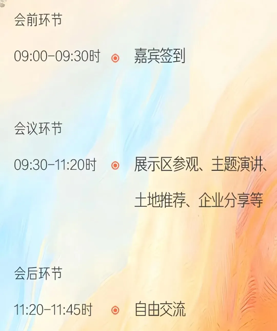 会议环节(9:30-11:20):展示区参观、主题演讲、土地推荐、企业分享等核心内容。