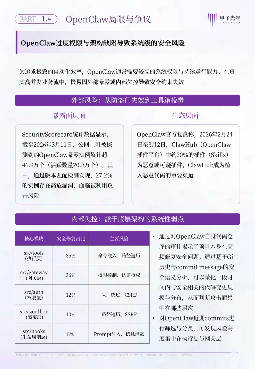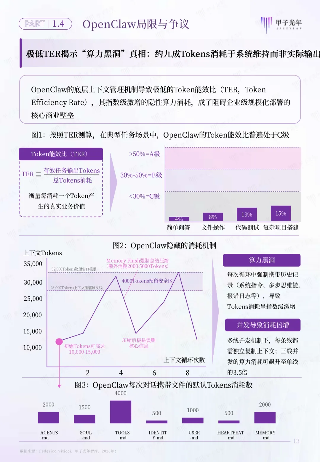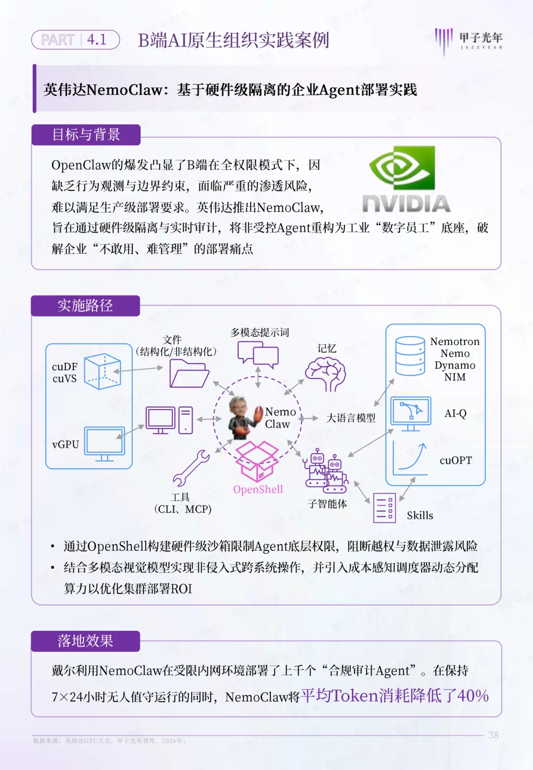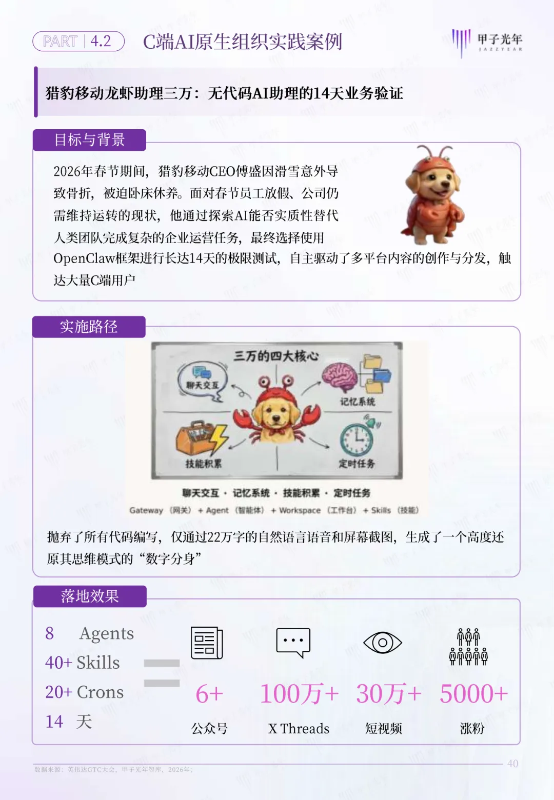 通俗来说,以前的企业,是“CEO-总监-经理-员工”的金字塔结构,企业的规模上限,取决于团队人数和管理能力;而流态型企业,核心是一个AI OS调度中枢,下面是无数个Agent执行单元,不用再养庞大的全职团队,就能7×24小时不间断运转,业务规模不再受人力边界的限制。比如以前一个电商运营团队要10个人,现在用OpenClaw搭建的流态体系,几个Agent就能搞定选品、上架、客服、数据分析全流程,人只需要做决策和风险兜底。对于普通人来说,我们永远困在一个死局里:一天只有24小时,再努力也有收入天花板,还要应付无尽的沟通内耗,一旦生病、休息,收入就立刻中断。而OpenClaw,彻底打破了个体“时间换钱”的线性收益模式,让普通个体能变成商业生态里的“生态节点”。这里的核心,就是WaaA(工作流即资产)。简单来说,你是一个擅长做小红书文案的博主,以前你只能一篇一篇写,靠时间换稿费;现在你可以把你写文案、做选题、优化标题、对接客户的全套经验,封装成一个可复用的工作流,通过OpenClaw变成一个标准化的Agent能力。无数企业和个人都能调用你的这个能力,你不用再花时间重复劳动,就能持续获得收益,你的个人经验,真正变成了可复制、可交易的数字资产。当流态型企业的调度能力,和生态节点的能力供给深度耦合,就形成了报告里定义的“AI原生组织”——一个以AI OS为中枢、Agent为执行单元的动态协同网络。企业和个人不再是雇佣关系,而是随需聚散的共生关系,彻底重构了延续百年的商业生产关系。很多人会问,AI原生组织听着很虚,真的有人落地了吗?答案是:不仅有,而且已经覆盖了B端企业、C端个体、G端政务全场景。B端标杆是英伟达的NemoClaw。它基于OpenClaw做了企业级深度定制,结合自家的Nemotron大模型、NIM推理框架和硬件能力,实现了硬件级的安全隔离,让企业的Agent能7×24小时不间断执行业务,还把Token成本直接降低了40%,是全球首个跑通的大型企业级AI原生组织实践。C端的标杆更贴近普通人。猎豹移动CEO基于OpenClaw,只用14天就搭出了无代码AI个人助理“三万”,整合了8个Agent、40+技能、20+定时任务,覆盖了100多个生活和工作场景,验证了普通人用OpenClaw快速实现商业闭环的可能。更极致的是极客开发者Sunlc,他只用一台Mac Mini,基于OpenClaw搭建了一套虚拟量化对冲基金的多Agent系统,一个人就干完了传统量化团队几十人的活,真正实现了“一人公司”的终极形态。而G端,深圳福田政务基于OpenClaw定制了DinTal Claw系统,上线3000+政务服务Agent,累计处理超3500件政务事项,7×24小时响应市民需求,还通过本地隔离和人工双审机制保障了数据安全,成为政务领域AI原生组织的标杆样本。当然,在OpenClaw掀起的热潮背后,我们也必须清醒地看到它的局限与争议,避免盲目跟风。第一个绕不开的问题,就是“算力黑洞”。报告里明确提到,OpenClaw的Token有效率(TER)最低仅4%,最高也不到15%,这意味着 约90%的Tokens都消耗在了系统维持、心跳机制、记忆刷新上,真正用在业务输出上的少之又少 。单轮任务最高能消耗32000Tokens,很多中小企业和个体,都面临“用得起框架,付不起算力钱”的尴尬。第二个核心问题,是系统级的安全风险。第三方机构SecurityScorecard测评显示,OpenClaw的安全评分仅46.9分,远低于行业安全线,27.2%的代码存在安全隐患,ClawHub里20%的技能插件都有漏洞。过度的权限申请、网关层的安全缺陷,很容易导致系统级的数据泄露和权限滥用,这也是企业落地最大的顾虑。第三个现实困境,是“淘金者迷失,卖水人盈利”的商业困局。现在大量开发者基于OpenClaw做二次开发,却很难跑通商业ROI;而大模型厂商、云厂商,却靠着算力和API服务赚得盆满钵满。整个生态的可持续商业闭环,至今还没有真正形成。面对这场变革,我们不用焦虑,也不用盲目跟风,不管是企业还是个体,都有循序渐进的落地路径。- 先梳理核心业务场景,找1-2个高频、标准化的环节,用OpenClaw搭建第一个Agent,先跑通最小闭环;