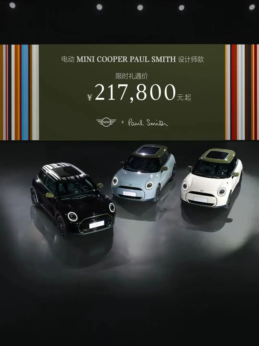 3月20日,在一场融合收藏展和时尚秀的“MINI好故事春季发布会”上,MINI与英国设计大师Paul Smith联袂打造的电动MINI COOPER PAUL SMITH设计师款在中国市场正式上市,售价21.78万元起。客户在3月31日前下单,还可叠加包括“购置税清零”在内的多项限时礼遇。该车提供六种源于Paul Smith灵感的独特色彩组合。这不仅是MINI个性化产品策略的代表,更是少数能真正驶上街头的设计师作品。