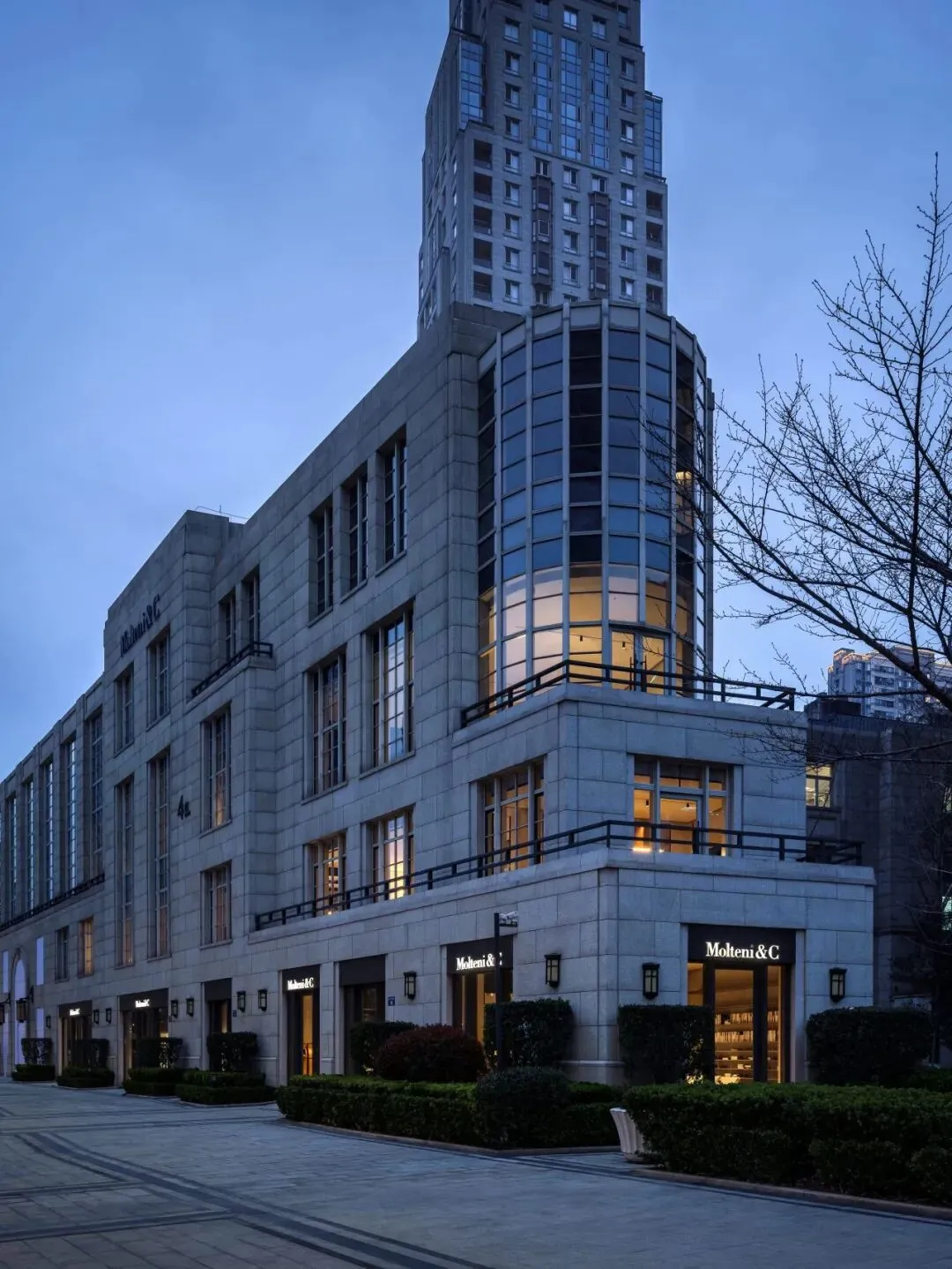Molteni&C杭州旗舰店落址于杭州钱江新城首个高密度住宅综合体——大都会79号。该处并非单纯住宅楼群,而是真正意义上的社区——一方规整庭园位居中央,四角各矗立37层的住宅楼。住宅建筑沿街四周环绕精品店铺,西侧毗邻的三角地块则专设零售空间与上层办公区域,进一步将社区融入未来发展脉络。