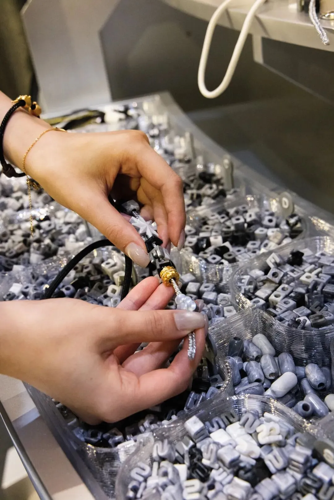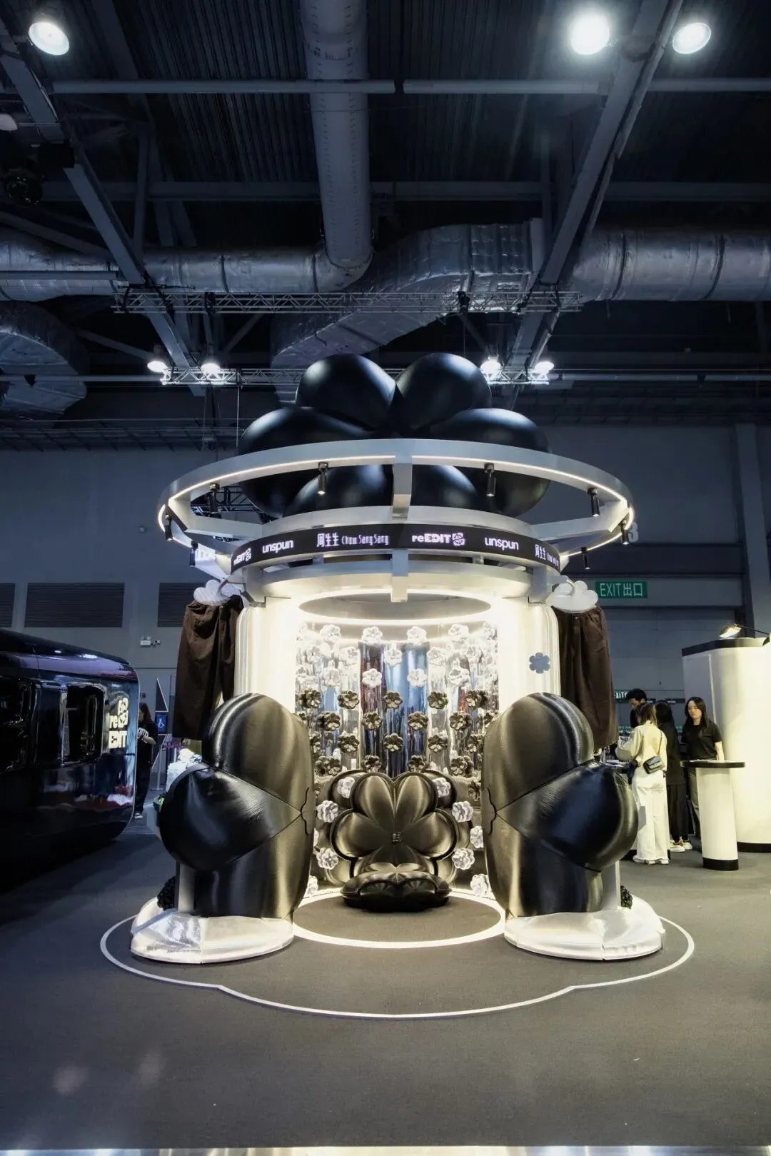 围绕The Perpetual Blossoms主题,周生生以鲜明的设计语言,打造出一个兼具未来感与潮流气息的环保时尚空间,演绎"传承不息,跨越时间的再生美态"。展台中心,象征永恒盛放的花型装置成为视觉焦点,在华丽张力与永续再生意涵之间,勾勒出独特而鲜明的气质。品牌以黑白块面、环形结构与模块化展示单元层层铺展,构筑一个独具先锋气息的沉浸式空间;四周错落展开的展示墙、"幸运轮"互动区与零售式体验单元,则延伸出更具层次感的观展路径,让消费者能够在不断切换的视角与动线中,感受展位别具一格的环保时尚风格轮廓。