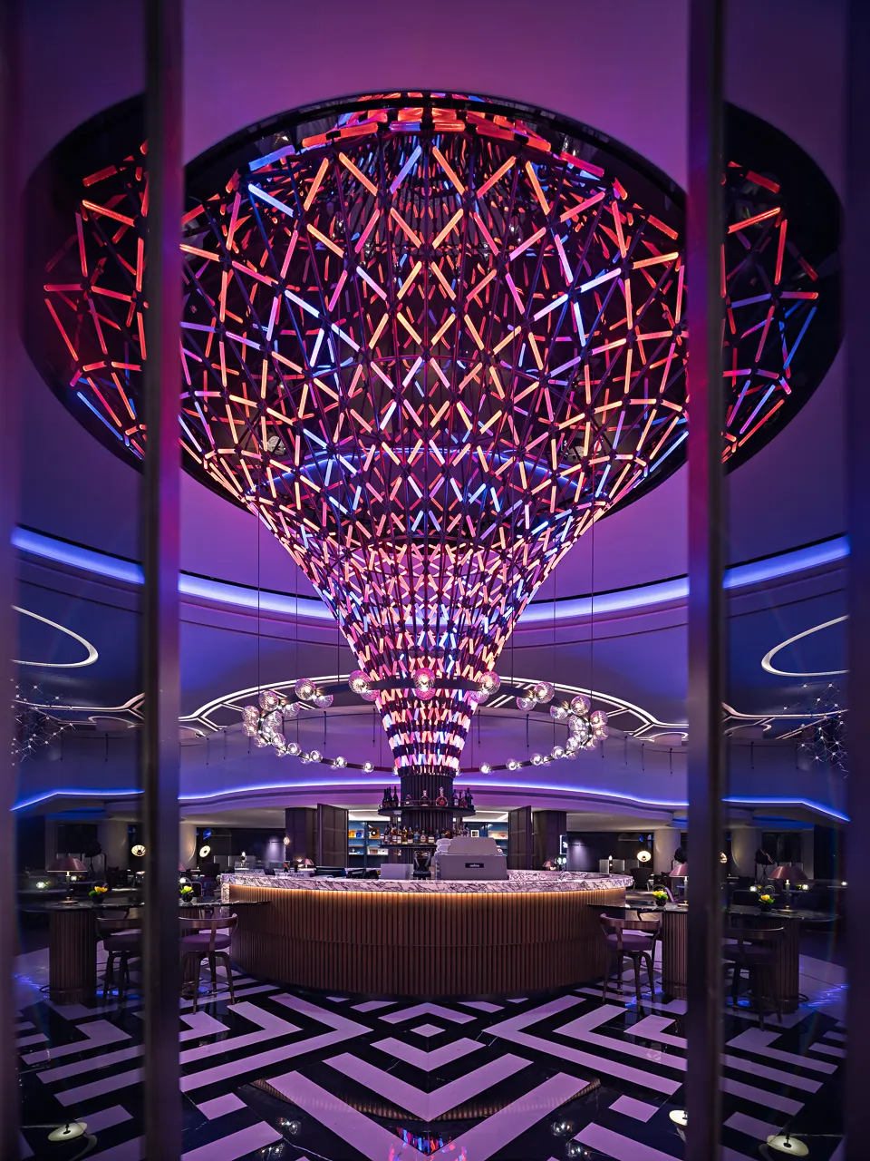 当白昼的喧嚣褪去,酒店一层的逸庭R BAR悄然完成华丽转身。夜幕降临,逸庭R BAR以万花筒与留声机为艺术装置灵感,在复刻的“霓虹舞台”下,通过四重精心设计的品牌仪式感——氛围唤醒、音乐互动、深夜小食、以及标志性的鸡尾酒唤醒仪式,为富有探索精神的宾客开启一场永不落幕的海派之夜,感受隐匿在虹桥霓虹背后的奢华律动。