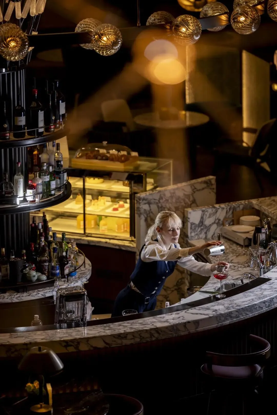 在逸庭R BAR特调的光影与现场音乐的恣情慢摇中,先锋调酒师洛丽塔(Lolita Derevenkova)将其俄罗斯血统的凛冽与上海的浪漫温柔极致融合。这杯艺术品融合了伏特加的凛冽、蓝橙力娇酒的幽邃以及浓奶油的丝滑,口感宛如老上海旋律中“蓝色多瑙河”般悠扬。在现场音乐的慢摇中,宾客恍若穿梭于复刻的“霓虹舞台”与回马廊的旗袍倩影间,续写繁华梦境。