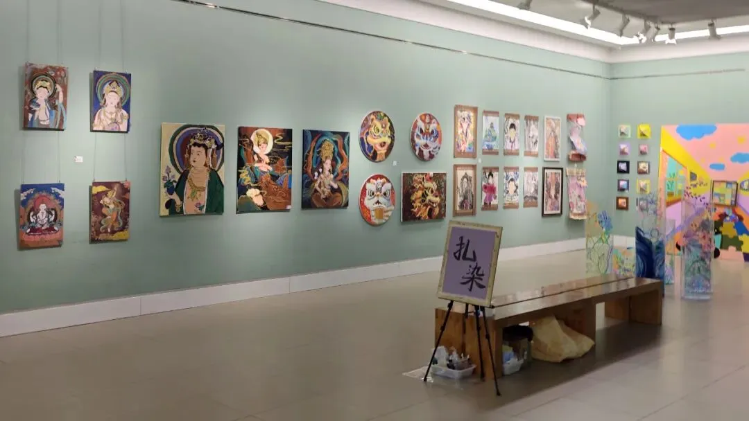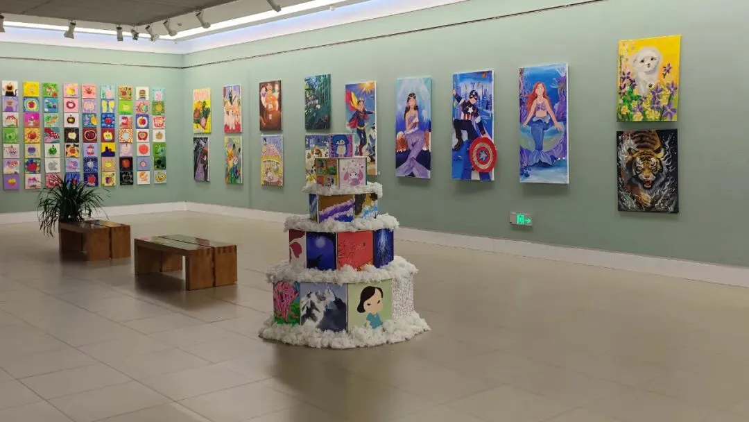 步入展厅,童趣盎然、色彩斑斓、奇思妙想的作品令人目不暇接。从灵动的自画像展示区,到致敬经典的名画临摹;从童话世界的遐想,到瑰丽的敦煌艺术探索;从肌理丰富的版画创作,到充满神话色彩的剪影故事;从线描勾勒的黑白空间,到笔墨端庄的书法创作。每一件作品都承载着孩子们对美的感知,记录着他们在艺术学习中收获的自信、快乐与成长。手持金色剪刀,在漫天彩带中为展览剪彩,百余只彩色气球同时升空,映照着孩子们亮晶晶的眼睛。