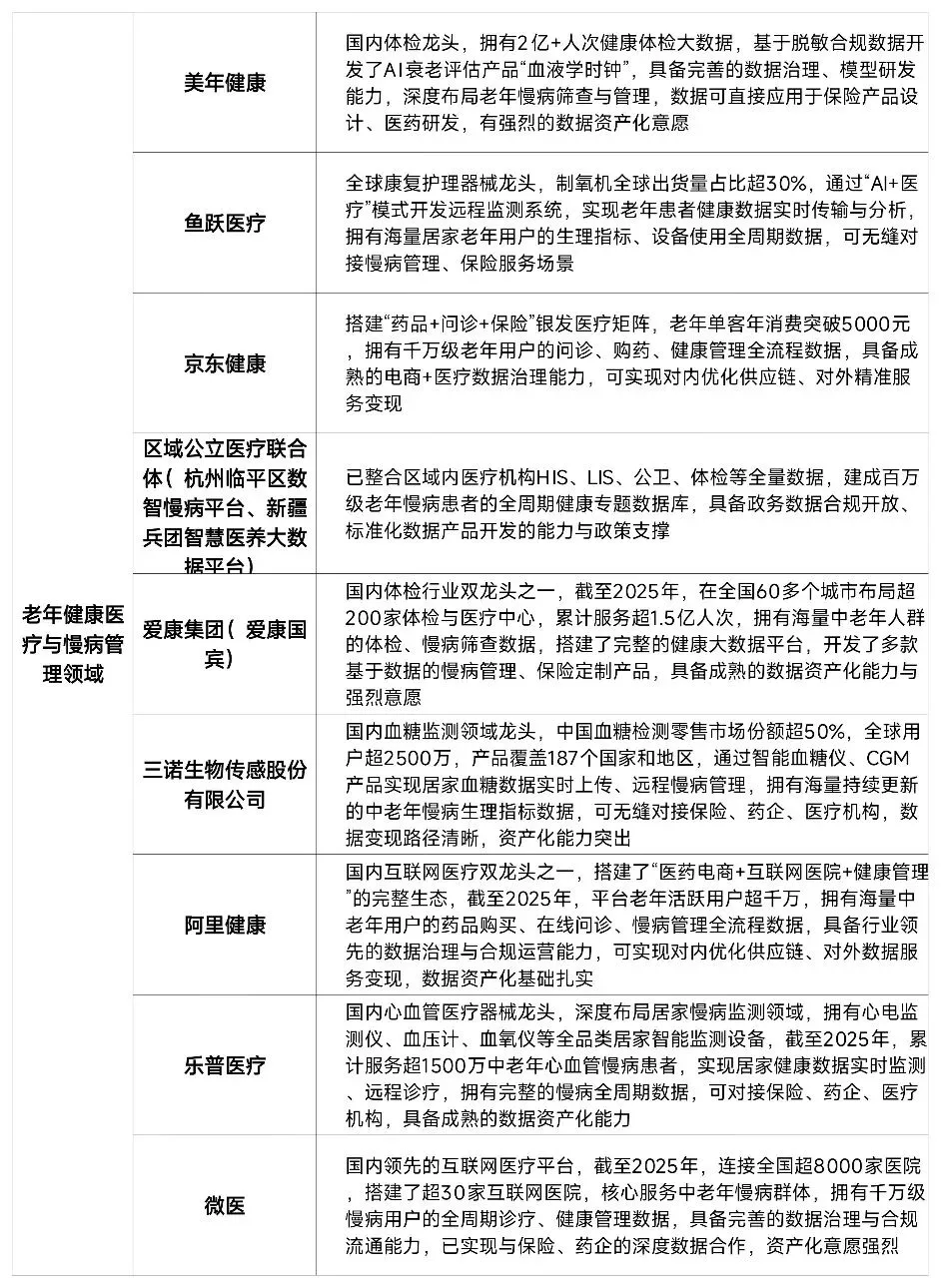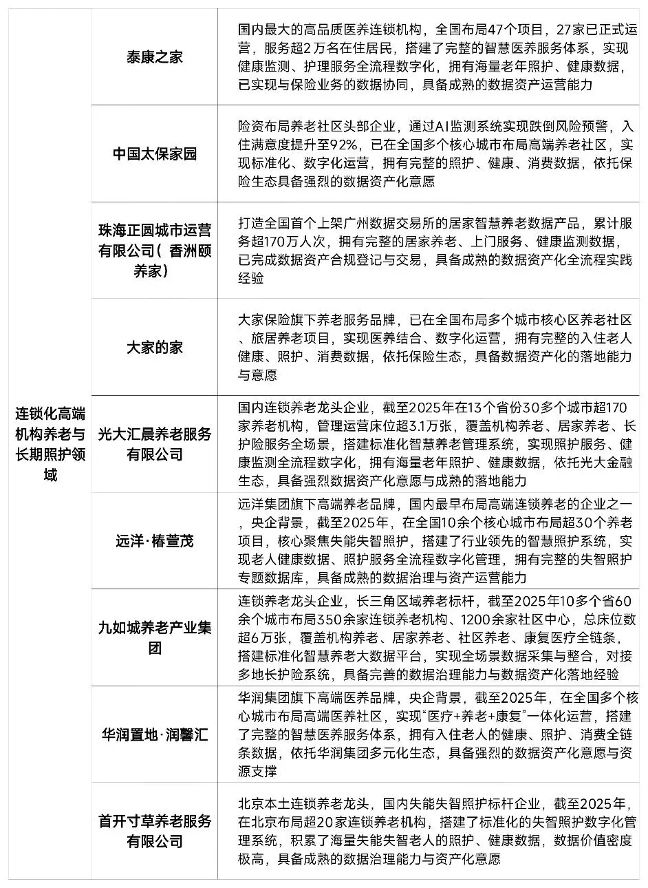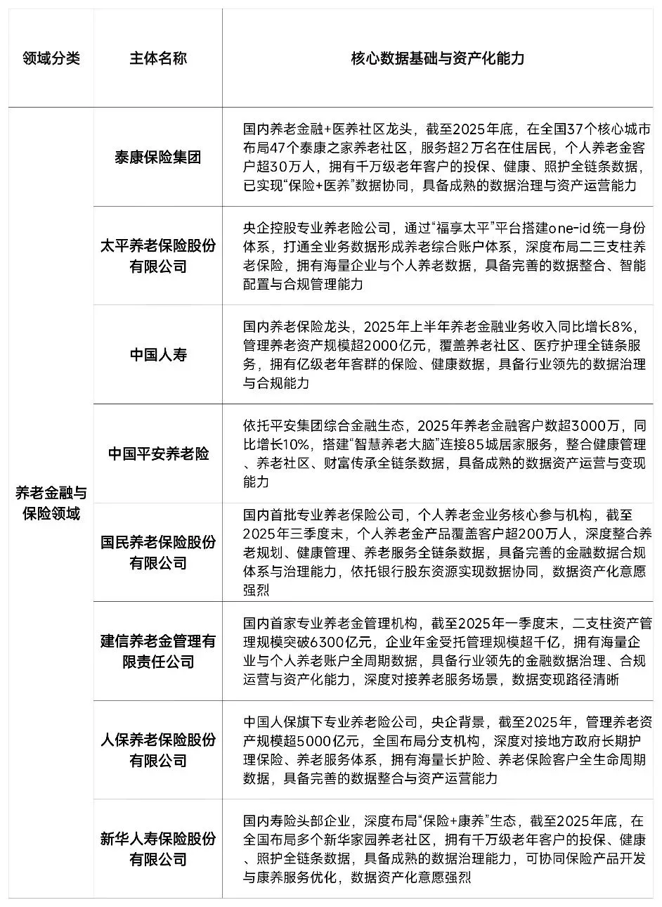 2. 数据基础扎实且结构化程度高:头部机构拥有千万级至亿级老年客群的全生命周期数据,覆盖身份信息、收支储蓄、投保理赔、健康管理、养老服务等维度,数据持续可追溯、标准化程度高,完全满足数据资产入表的质量要求