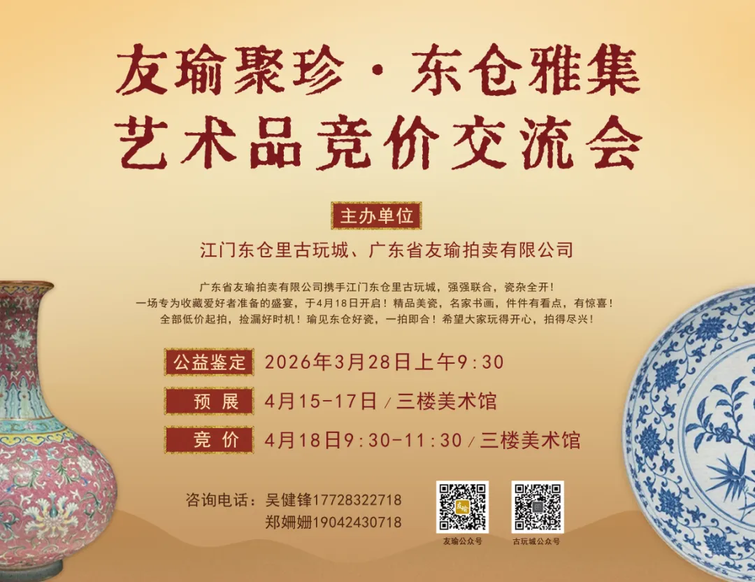 广东省友瑜拍卖有限公司携手东仓里古玩城专场公益鉴宝与拍品征集活动同步开启,4位鉴定师坐阵加持,为藏友提供更全面、专业的鉴定服务。