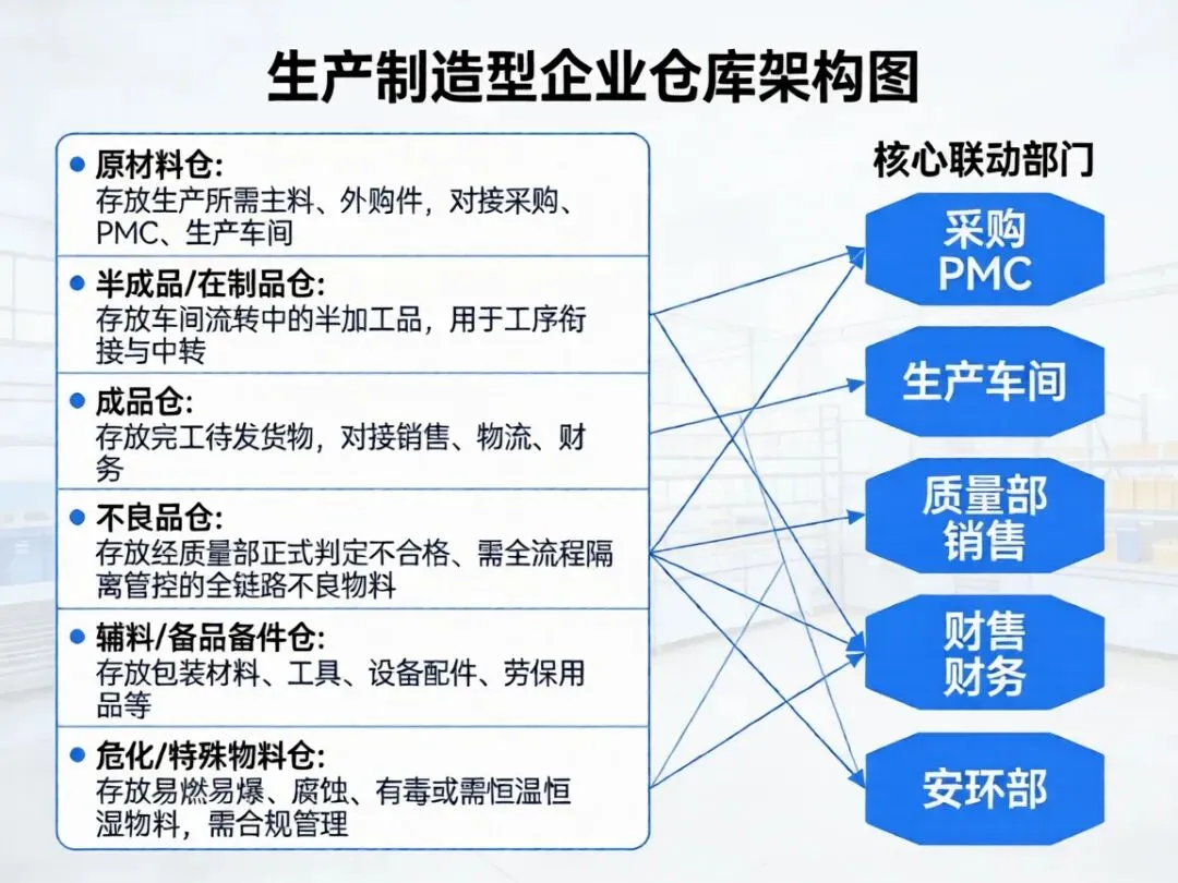 原材料仓:存放生产所需主料、外购件,对接采购、PMC、生产车间。