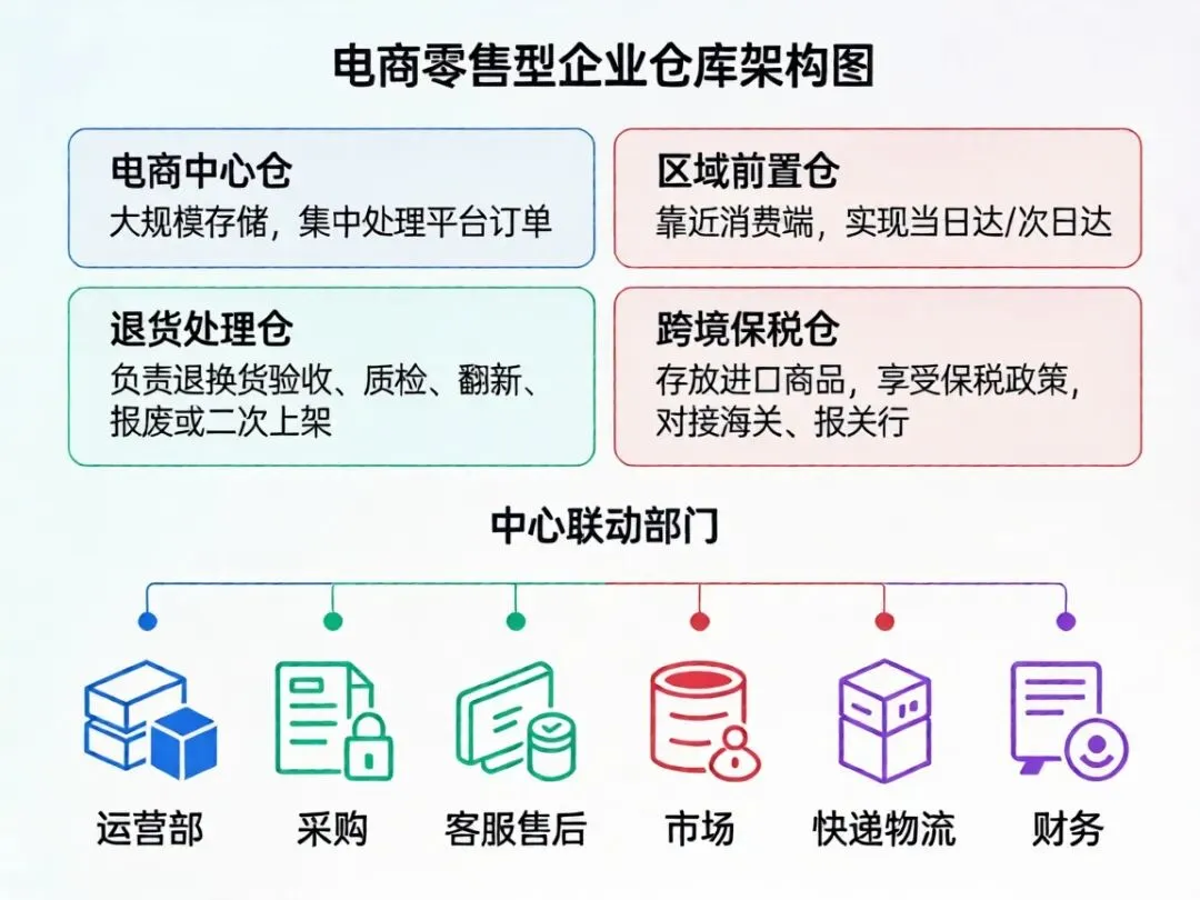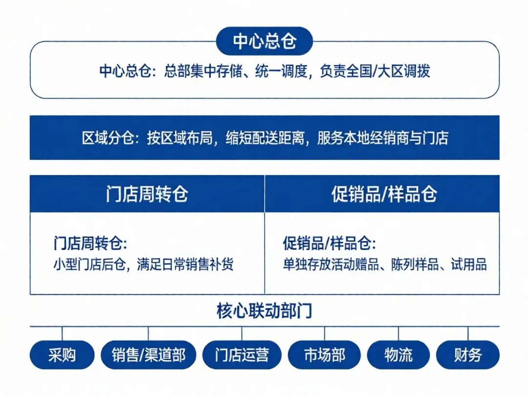 中心总仓:总部集中存储、统一调度,负责全国 / 大区调拨。
