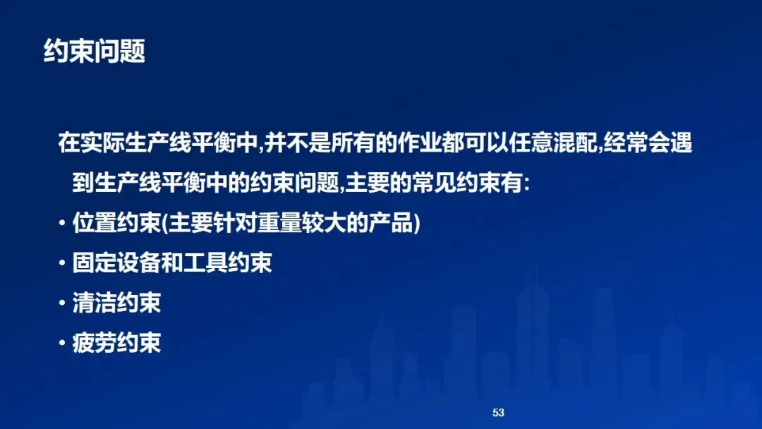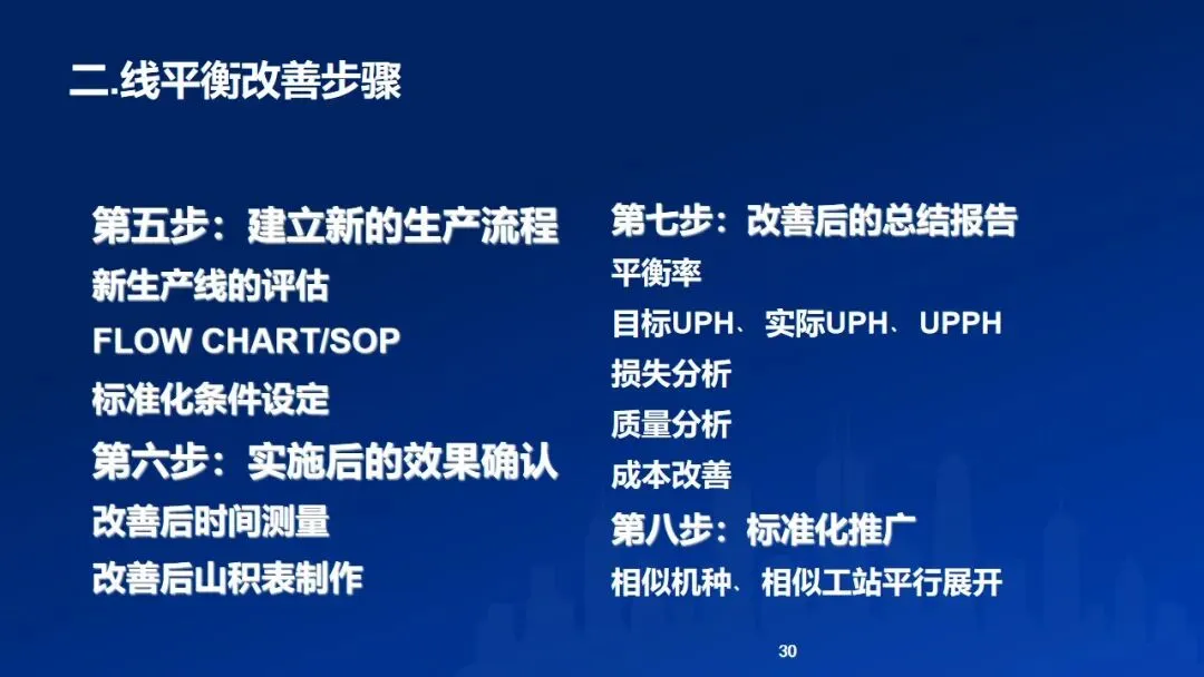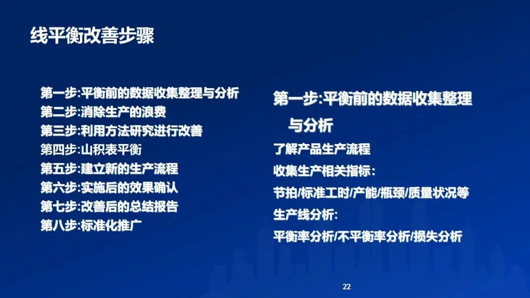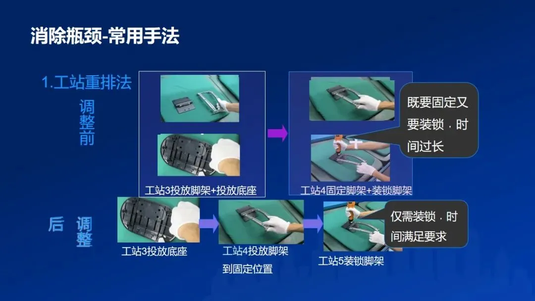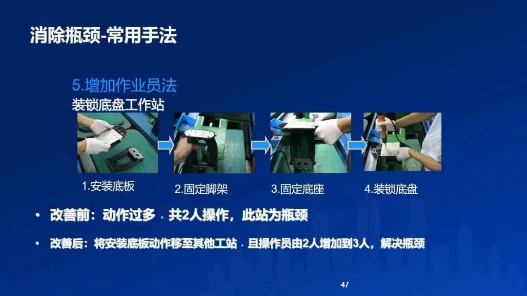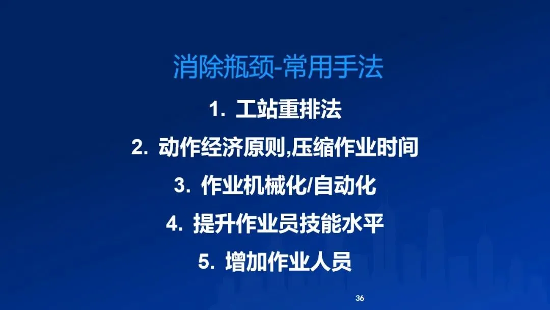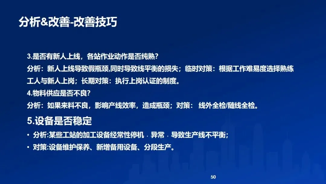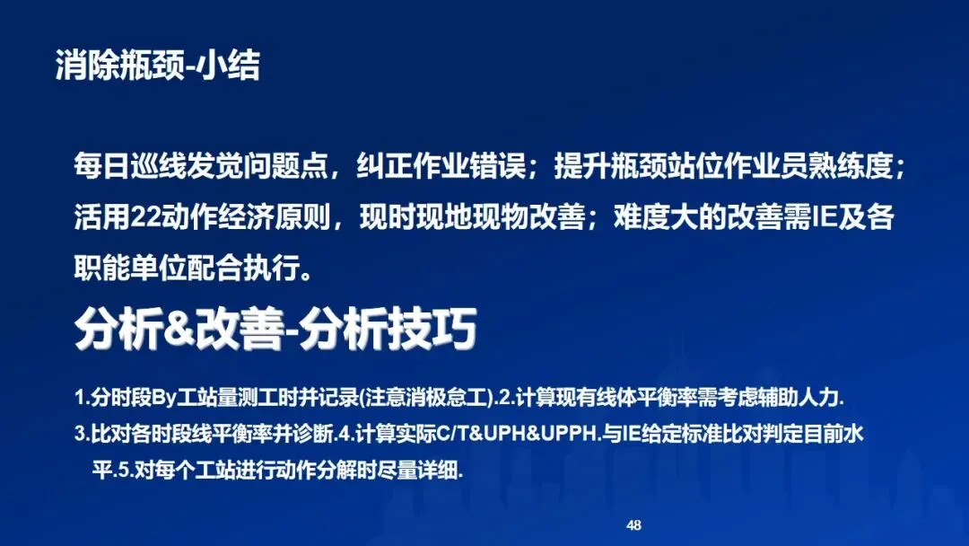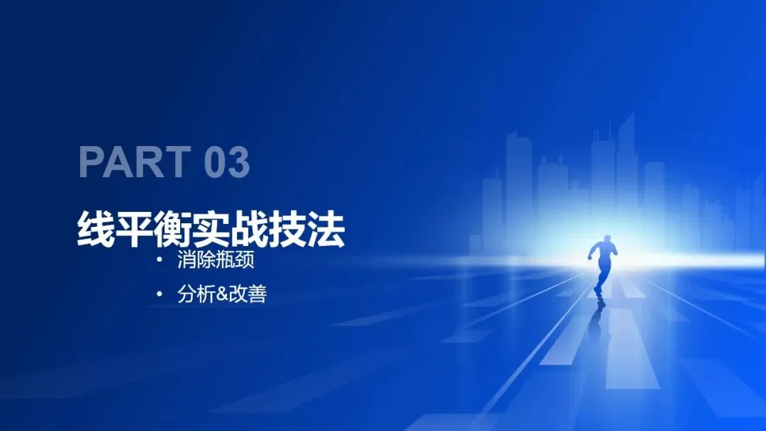在改善方法上,课件提出了八步实施流程:从数据收集、浪费消除、方法研究(动作、流程、操作分析),到山积表平衡、新流程建立、效果确认、总结报告与标准化推广。重点强调“消除瓶颈”是提升平衡率与整体效率的核心,并结合大量实战案例,展示了如何运用动作经济原则、工站重排、作业机械化与自动化、工装治具开发、人员技能提升、增加作业员等手段压缩瓶颈工时、优化作业配置。此外,课件还分析了生产线平衡中常见的位置约束、设备工具约束、清洁与疲劳约束等现实限制,并提出“打破平衡”理念,即在流程相对稳定后,通过持续挖掘非增值动作、重新优化工序,实现更高层次的平衡与效率提升。整体内容突出了生产线平衡作为精益生产与工业工程重要工具,在提升产出、缩短周期、降低成本方面的系统性与实践性。