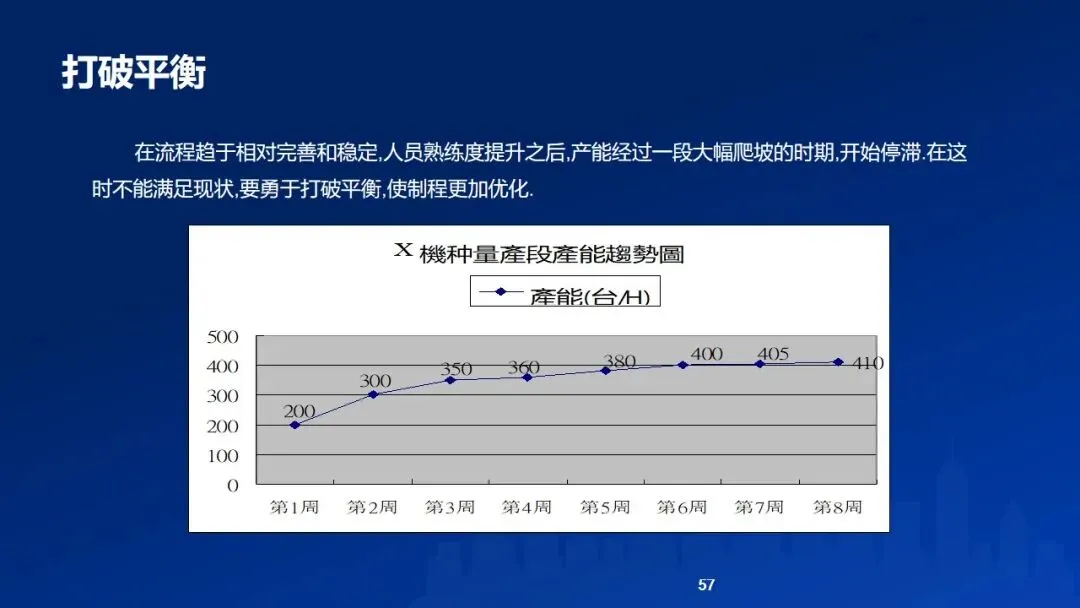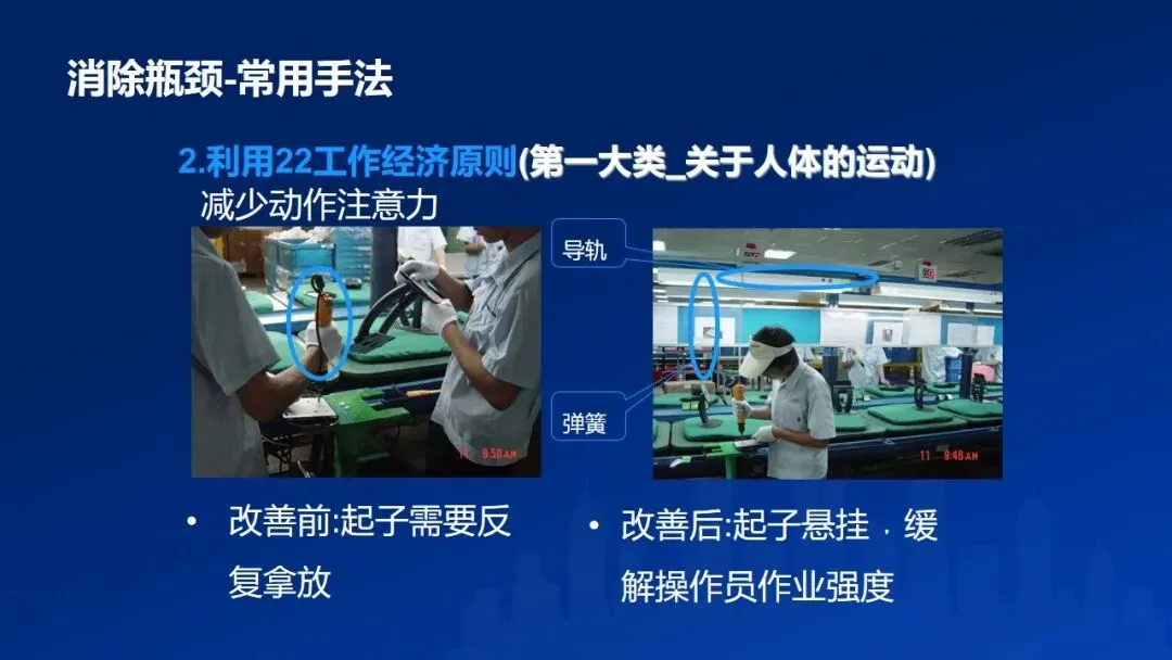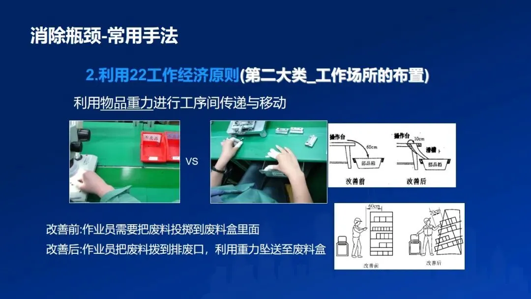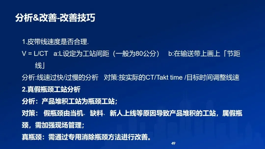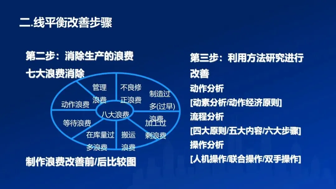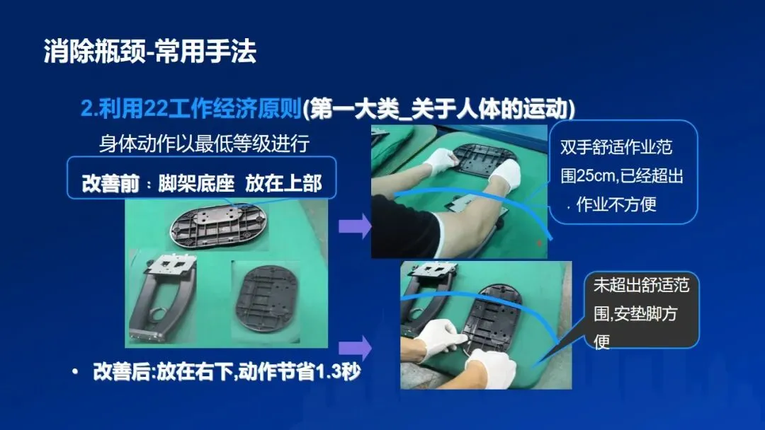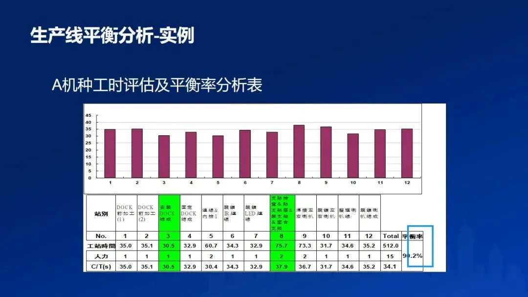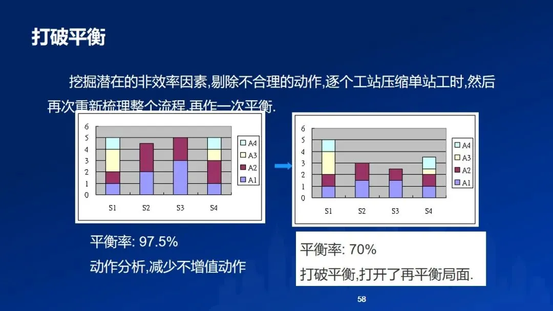 在改善方法上,课件提出了八步实施流程:从数据收集、浪费消除、方法研究(动作、流程、操作分析),到山积表平衡、新流程建立、效果确认、总结报告与标准化推广。重点强调“消除瓶颈”是提升平衡率与整体效率的核心,并结合大量实战案例,展示了如何运用动作经济原则、工站重排、作业机械化与自动化、工装治具开发、人员技能提升、增加作业员等手段压缩瓶颈工时、优化作业配置。此外,课件还分析了生产线平衡中常见的位置约束、设备工具约束、清洁与疲劳约束等现实限制,并提出“打破平衡”理念,即在流程相对稳定后,通过持续挖掘非增值动作、重新优化工序,实现更高层次的平衡与效率提升。整体内容突出了生产线平衡作为精益生产与工业工程重要工具,在提升产出、缩短周期、降低成本方面的系统性与实践性。