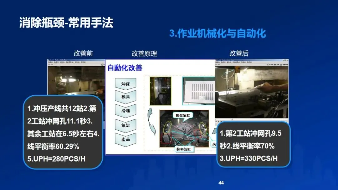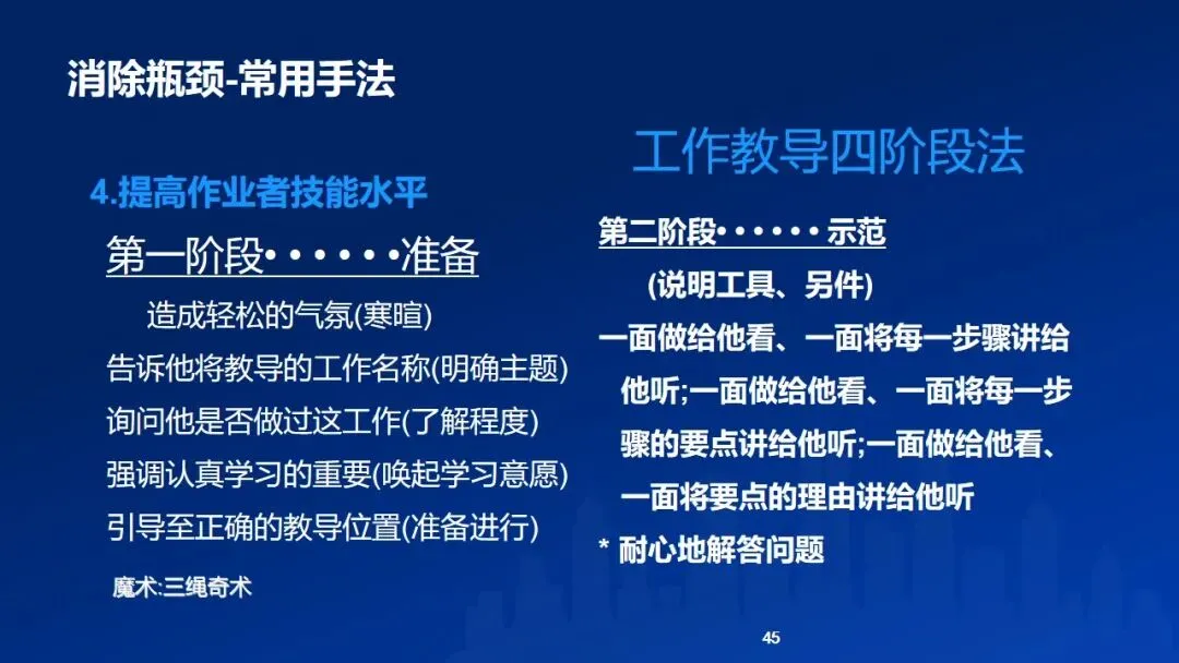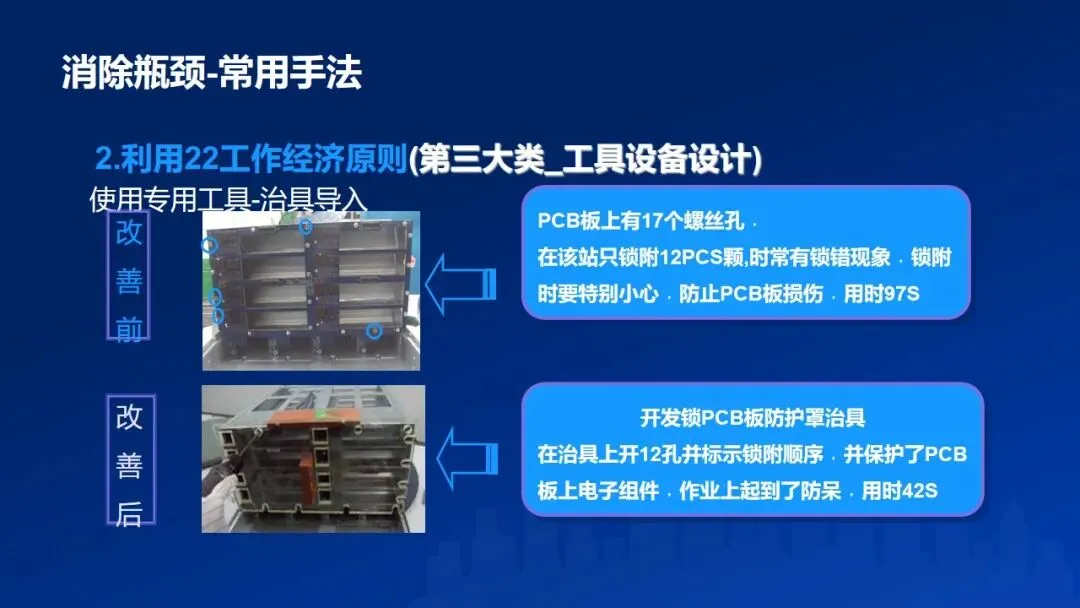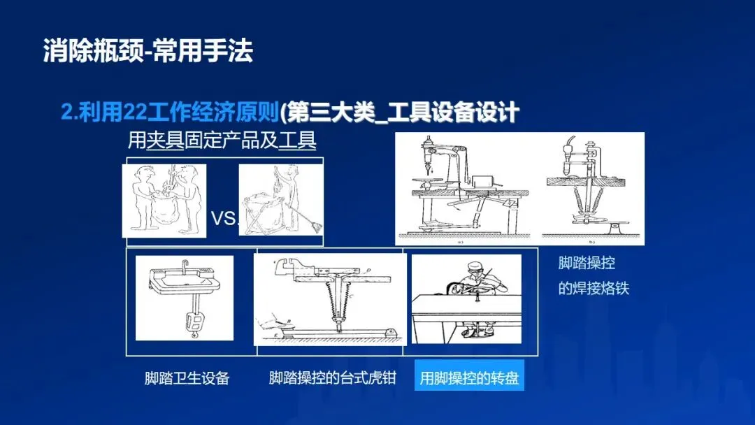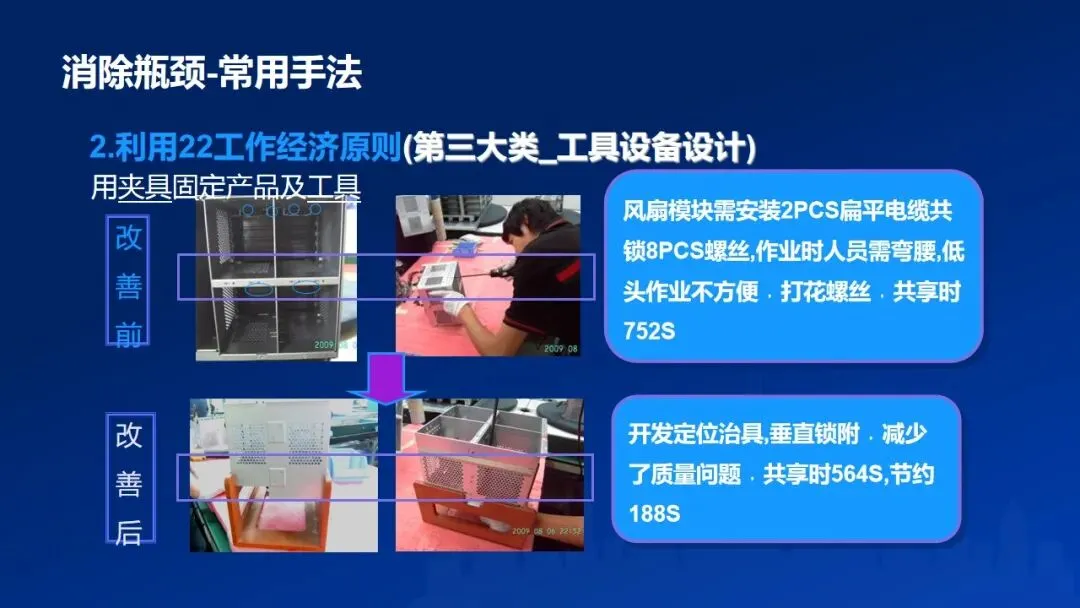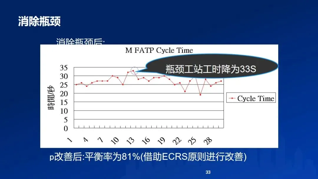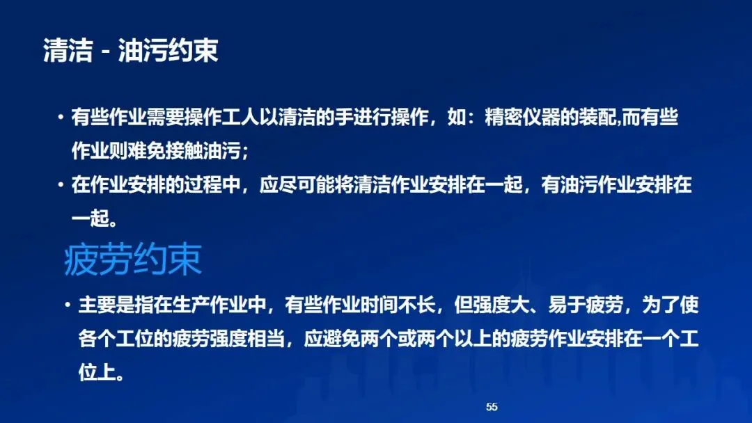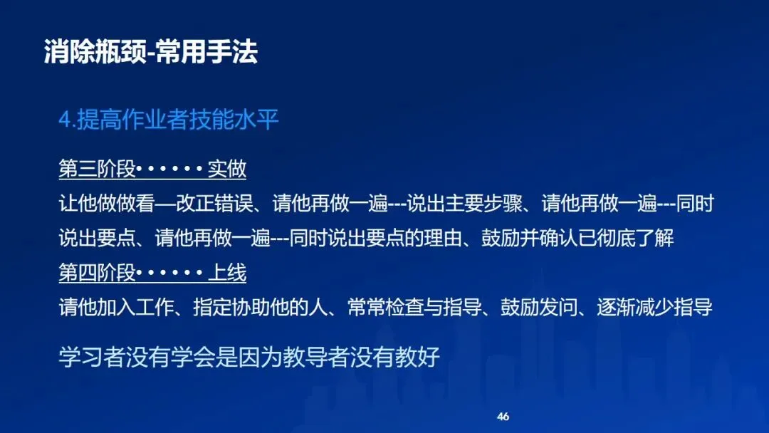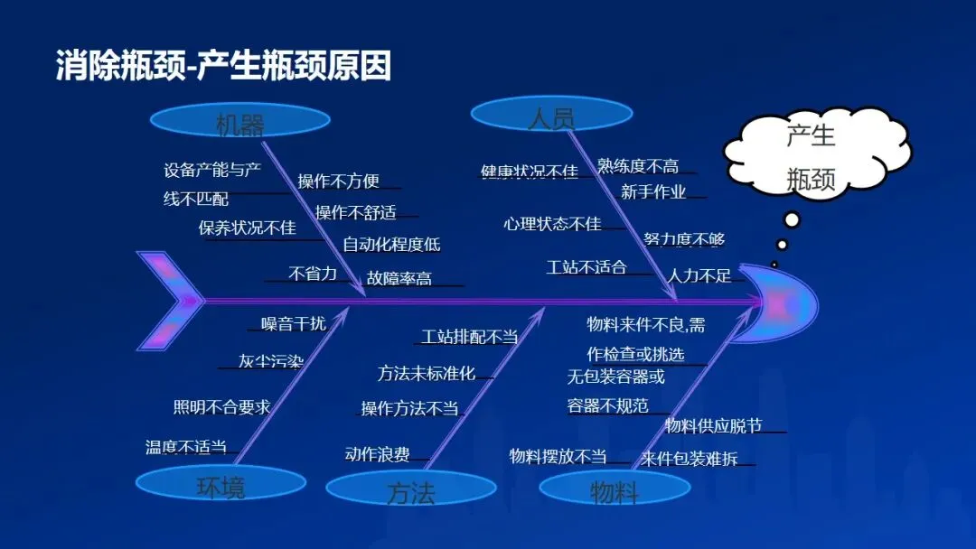 在改善方法上,课件提出了八步实施流程:从数据收集、浪费消除、方法研究(动作、流程、操作分析),到山积表平衡、新流程建立、效果确认、总结报告与标准化推广。重点强调“消除瓶颈”是提升平衡率与整体效率的核心,并结合大量实战案例,展示了如何运用动作经济原则、工站重排、作业机械化与自动化、工装治具开发、人员技能提升、增加作业员等手段压缩瓶颈工时、优化作业配置。此外,课件还分析了生产线平衡中常见的位置约束、设备工具约束、清洁与疲劳约束等现实限制,并提出“打破平衡”理念,即在流程相对稳定后,通过持续挖掘非增值动作、重新优化工序,实现更高层次的平衡与效率提升。整体内容突出了生产线平衡作为精益生产与工业工程重要工具,在提升产出、缩短周期、降低成本方面的系统性与实践性。