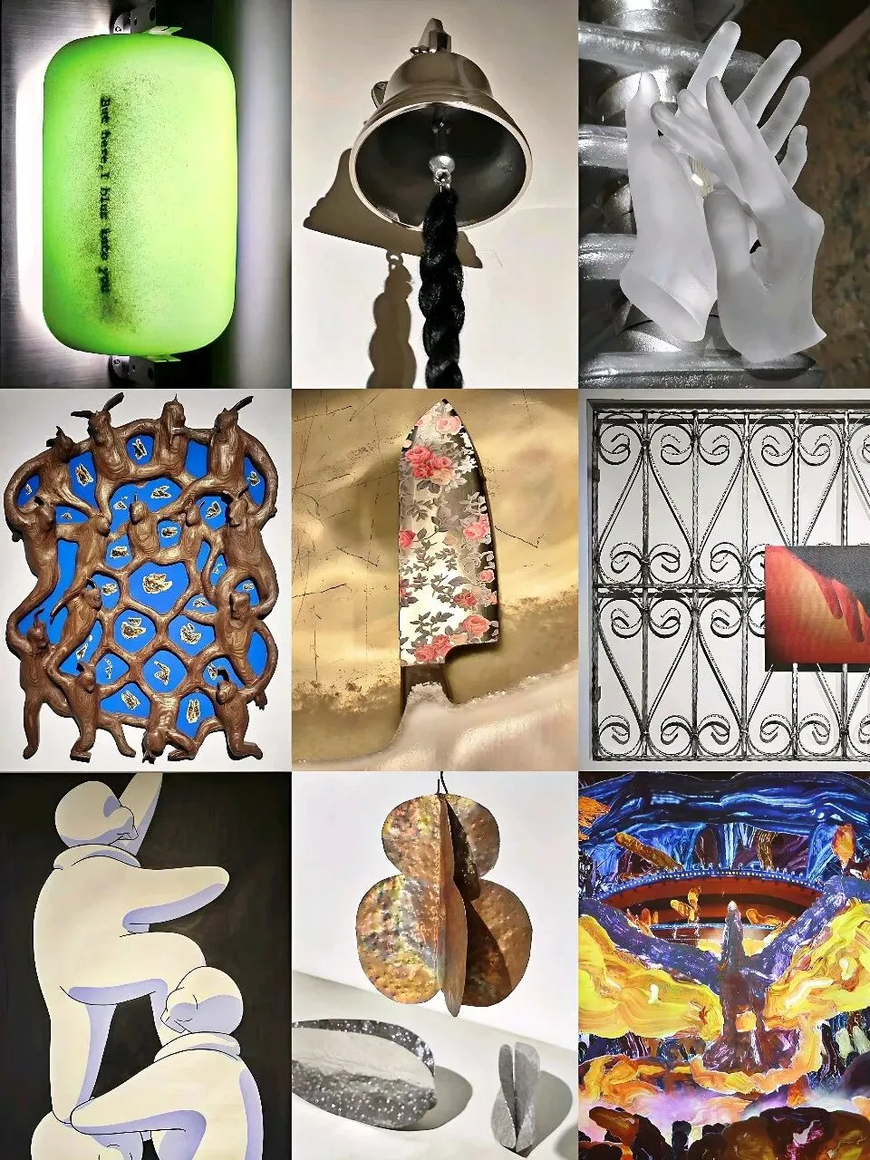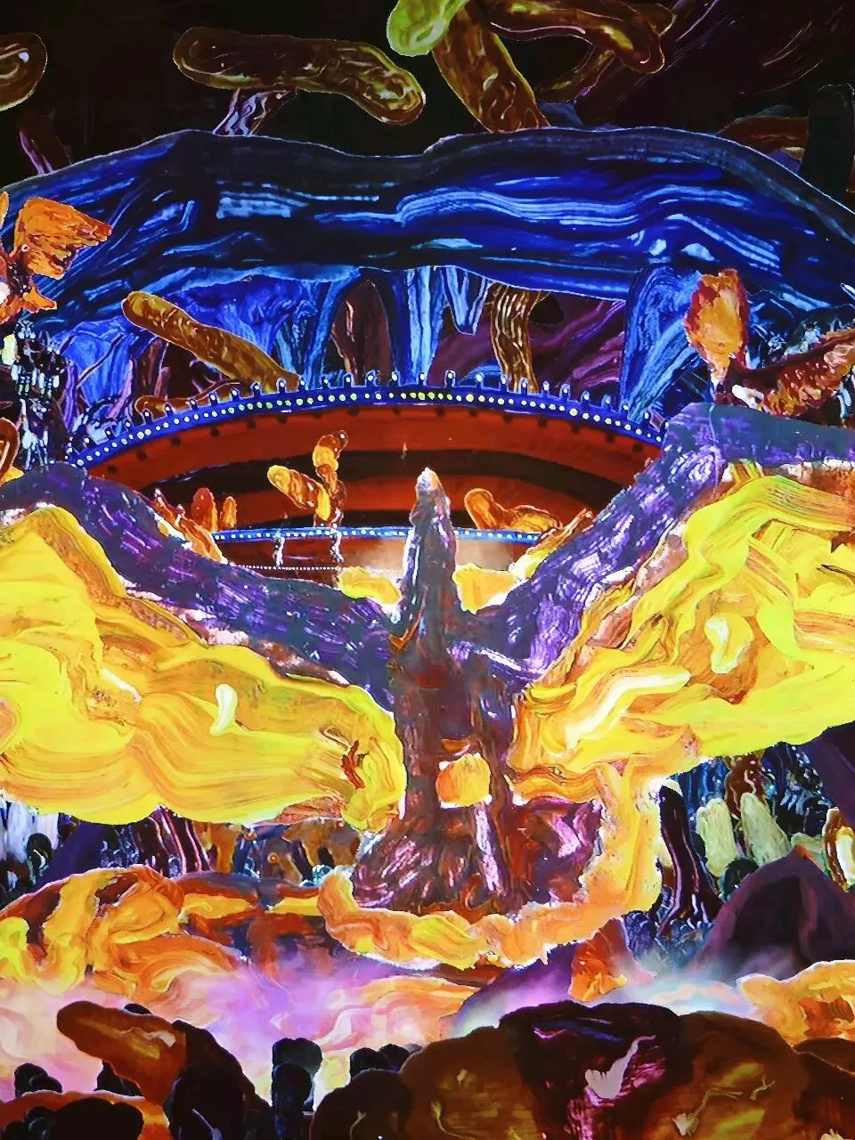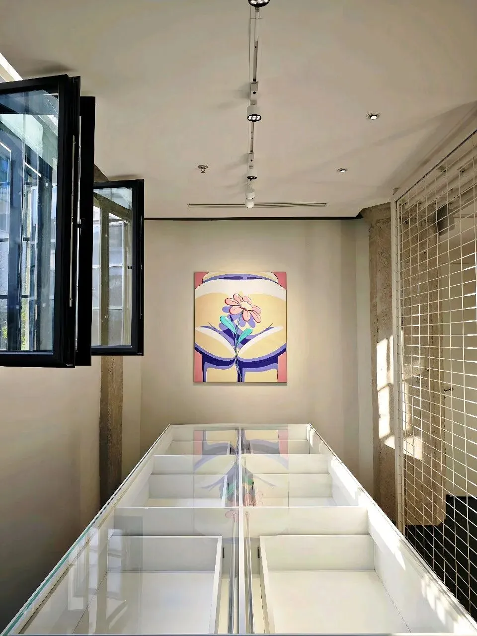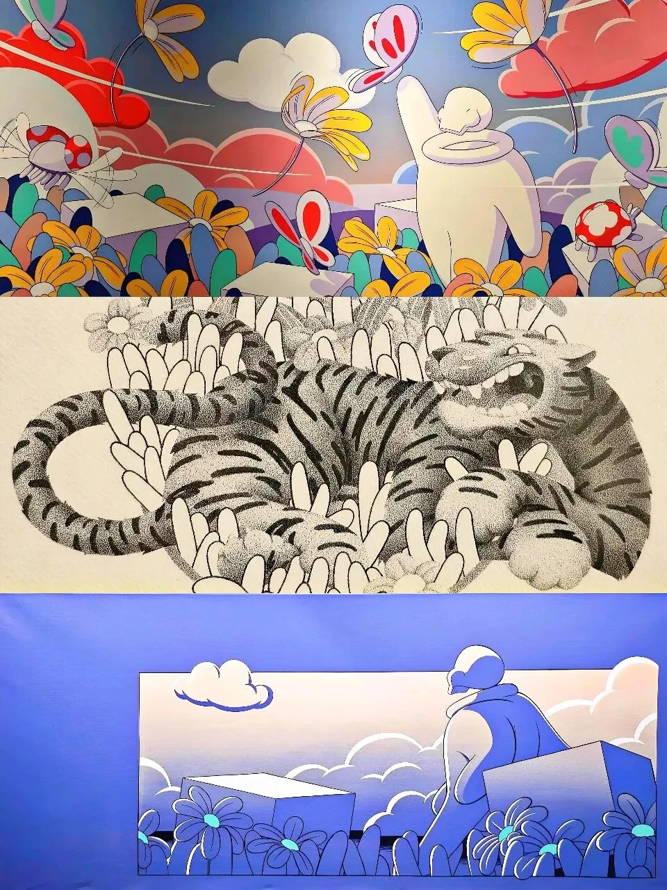 以点描绘画与标志性的“ALL”小手形象,在云朵、蝶翼与花朵的意象中唤醒纯粹童真。艺术家以冥想式点阵技法凝固时间碎片,邀请观众重返那个被遗忘的、充满好奇的游乐场。