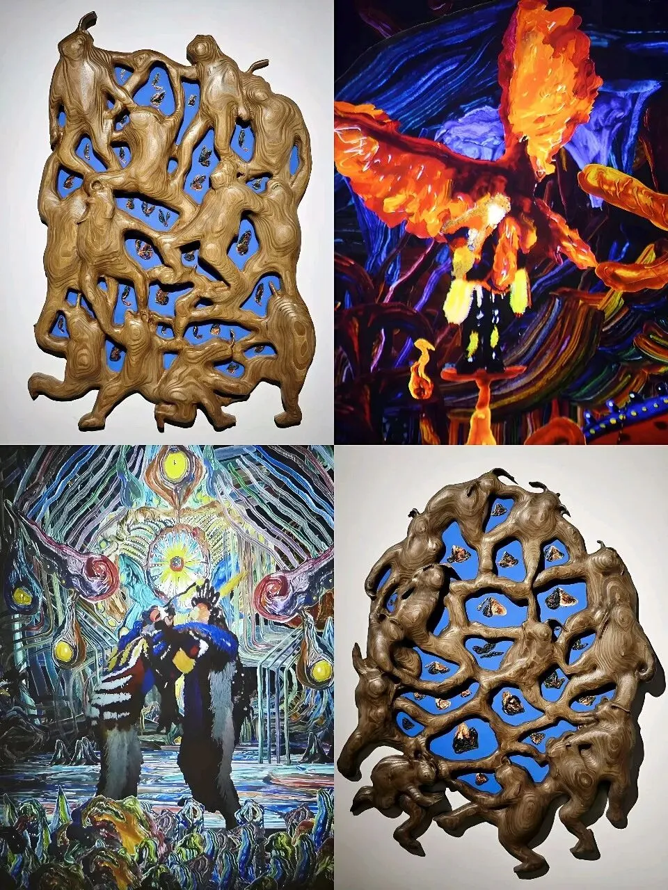 三屏影像以精密循环结构解构共生关系,木质雕塑则以生物性肌理呼应主题。局部蓝色涂层隐喻虚拟维度的入口,在原始肌理与数字幻象的交织中,秩序松动又重组。
