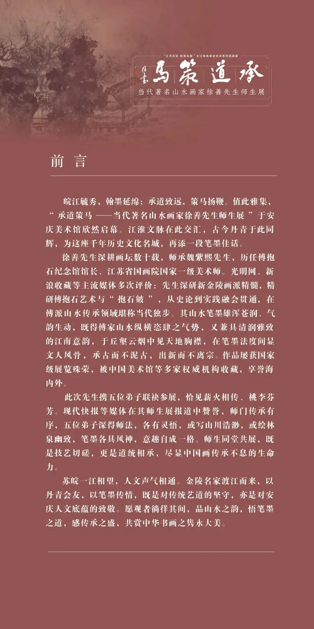 展览预告|| 江天共览•皖美如画 长三角名家进安庆系列邀请展——“承道策马”当代著名山水画家徐善先生师生展