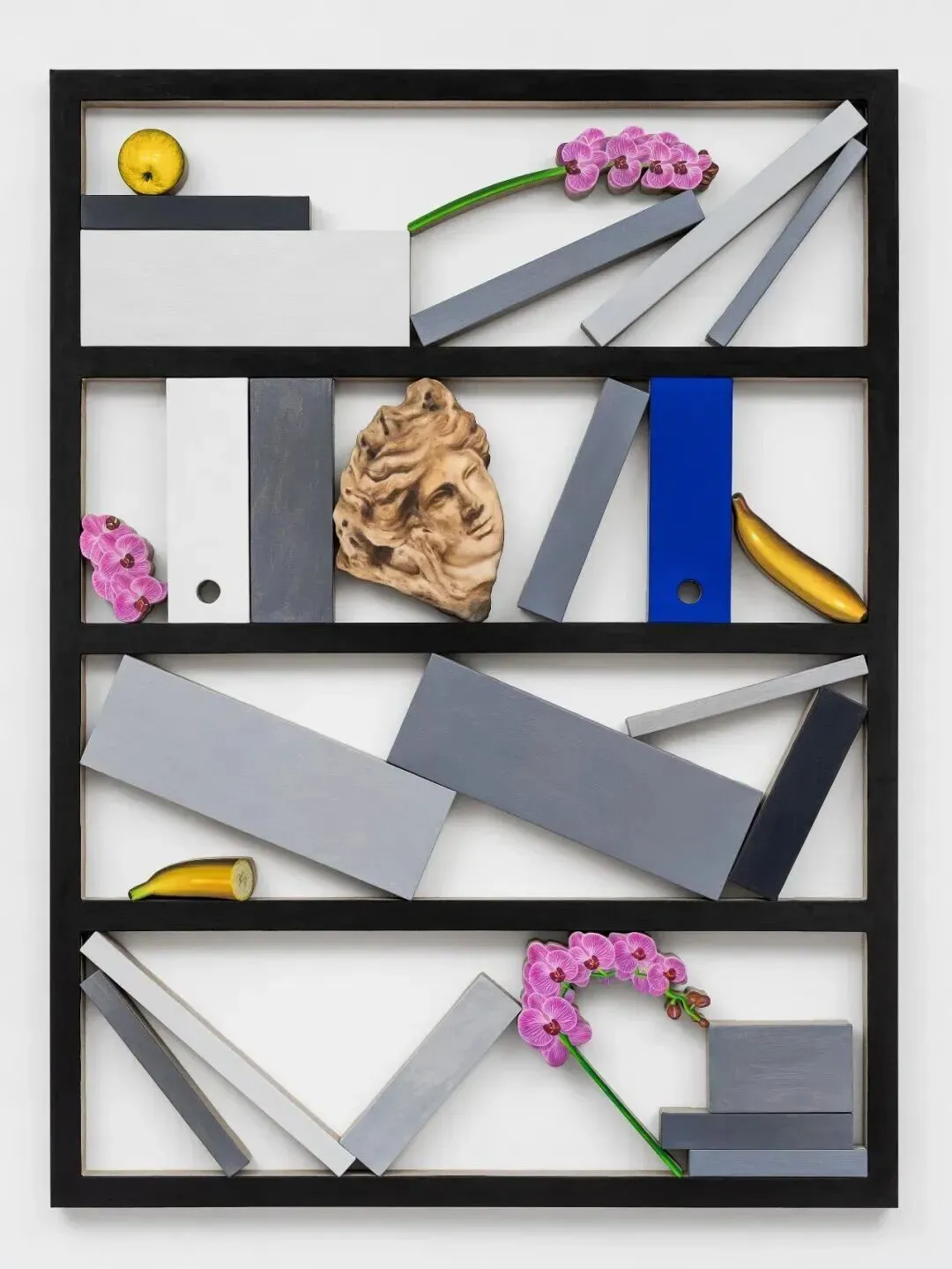 施泰格尔的创作始于对技术的沉迷:他的异形画布所模仿的物体的形态,如木板、家具、汽车等,不仅是视觉上的写实,更是物理形态的嵌入。画布不仅呈现物品,更将其包裹其中。在其持续创作的《书架(Case)》系列中,书架状的画作里摆放着抽象的文件夹与冰冷的书籍,却被生活日常的微小痕迹——水果、香烟、礼品或是海报——所打断。这些“中断”打破了工作秩序的单调,在重复与功能的明确系统中,隐约透出徘徊的人影与生命的痕迹。每一件《书架》都维系着秩序与混乱、工作剪影与生活留痕之间的动态关系。