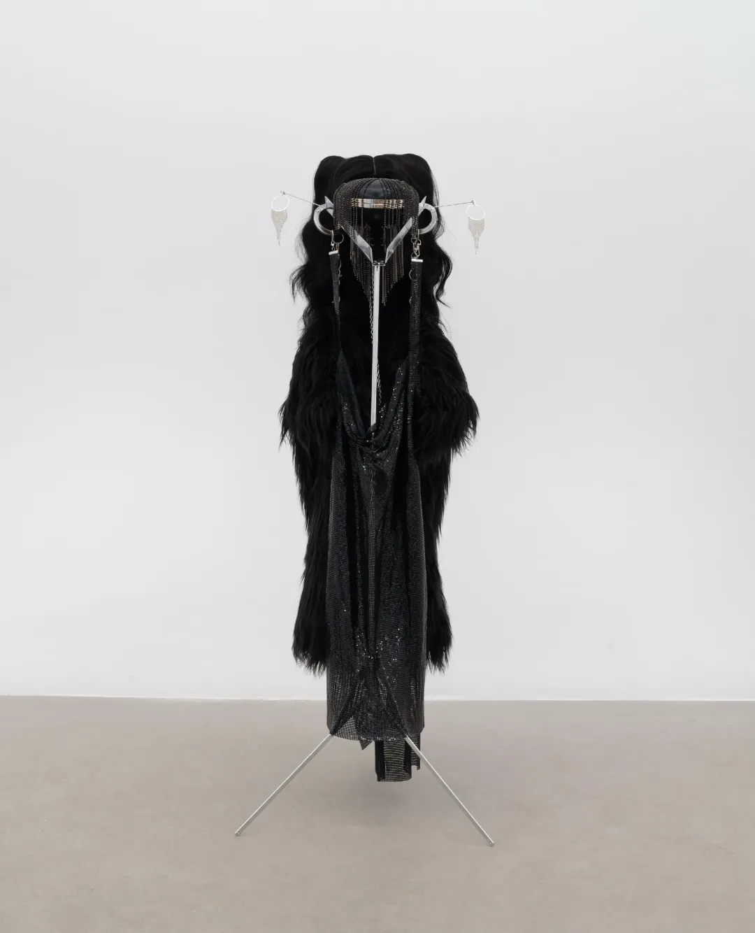Kayode Ojo,《¥99999 (Noire 23 plus FR)》,2023,谱架、亮片礼服、假发、仿皮草饰品、水钻手袋、耳饰、手铐、锁链,140 x 45 x 30 cm,吉吉收藏