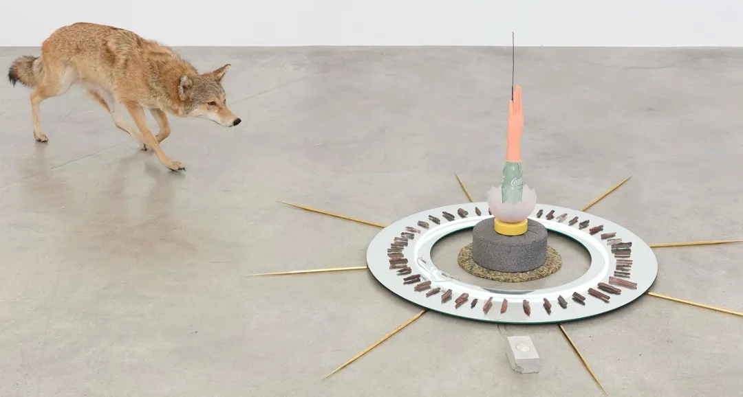 Gabriel Rico,《谁会将生命的终结视为自然的恩赐?(嫉妒的神)(Who reckons the close of his life among the boons of the nature? (The Jealous God))》,2018,郊狼标本、硅化木、金属丝、塑料手、玻璃瓶、陶瓷、火山石、水平仪、海绵、霓虹灯、镜面、黄铜,75 × 190 × 340 cm,Coobe 收藏