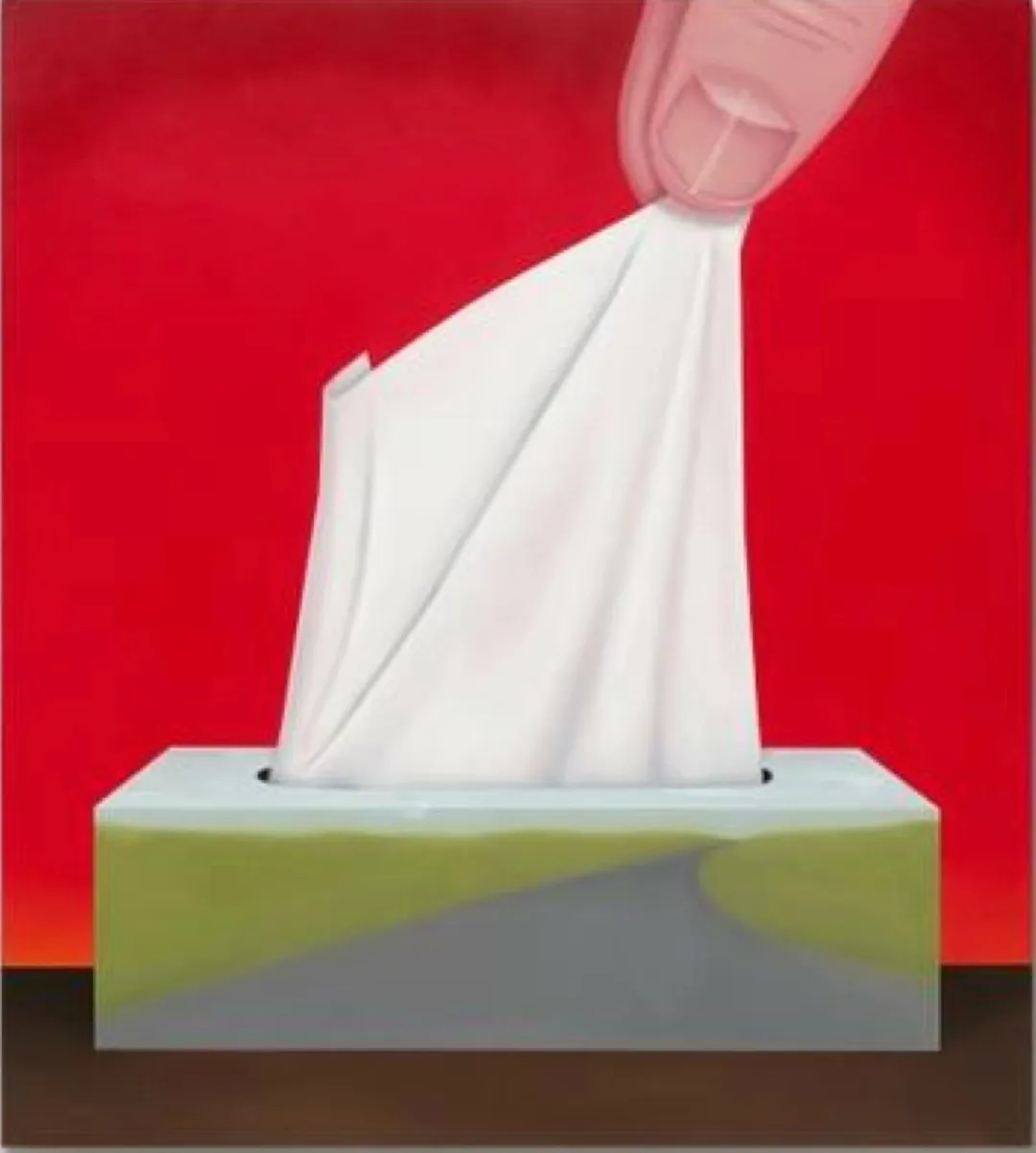 《Tissue》画面以红色背景和棕色桌面为基调,一只手的拇指和食指轻捏纸巾角落,日常动作被夸张与放大处理。以局部放大的“纸巾”形象构成画面主体,使柔软、轻盈的物体获得雕塑般体量。作品延续艺术家对尺度转换与日常物品陌生化的探索,强调观看本身作为一种建构行为。