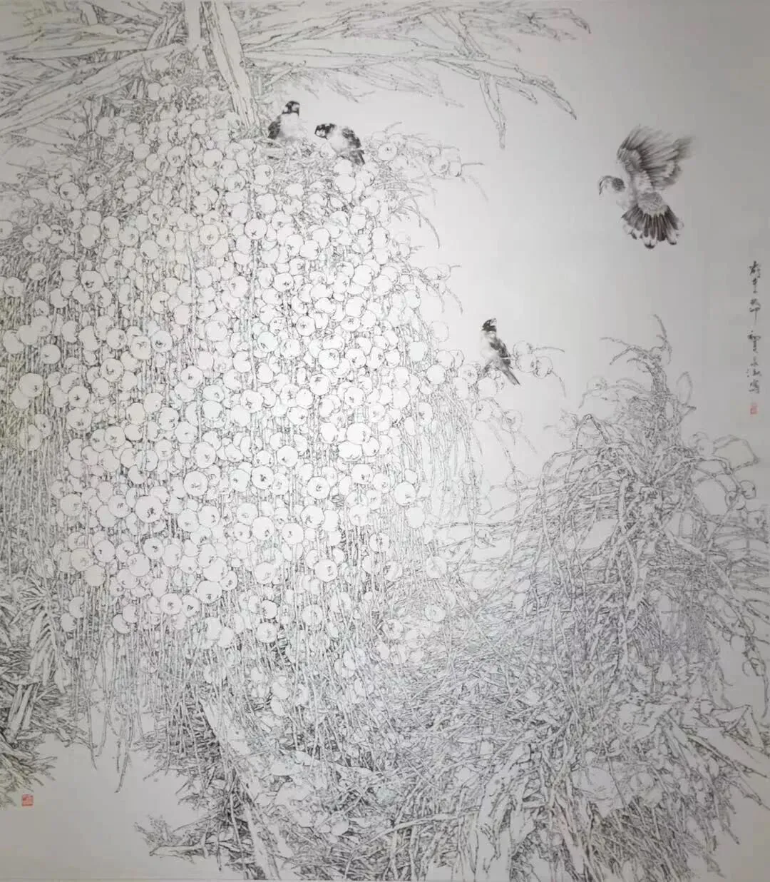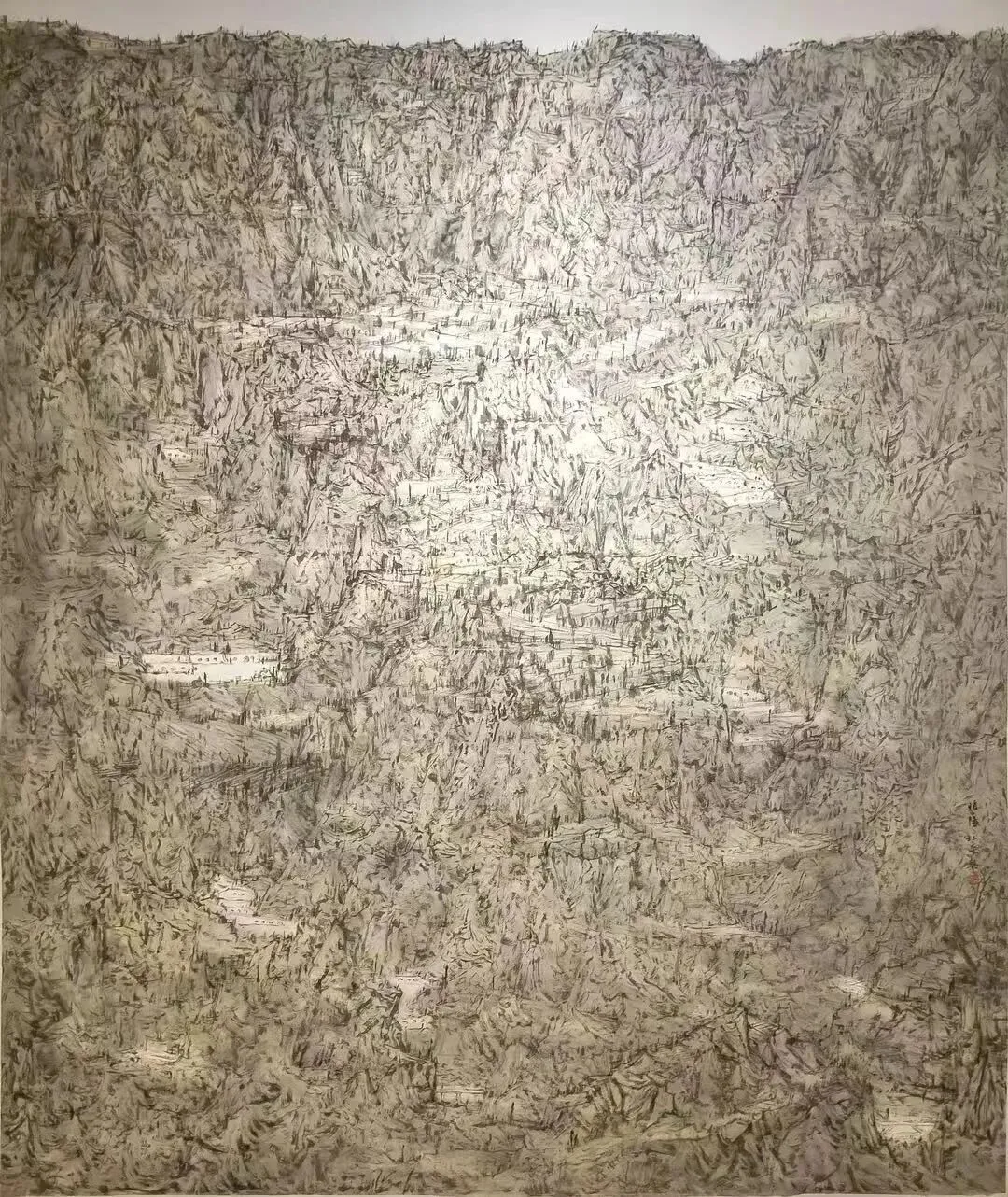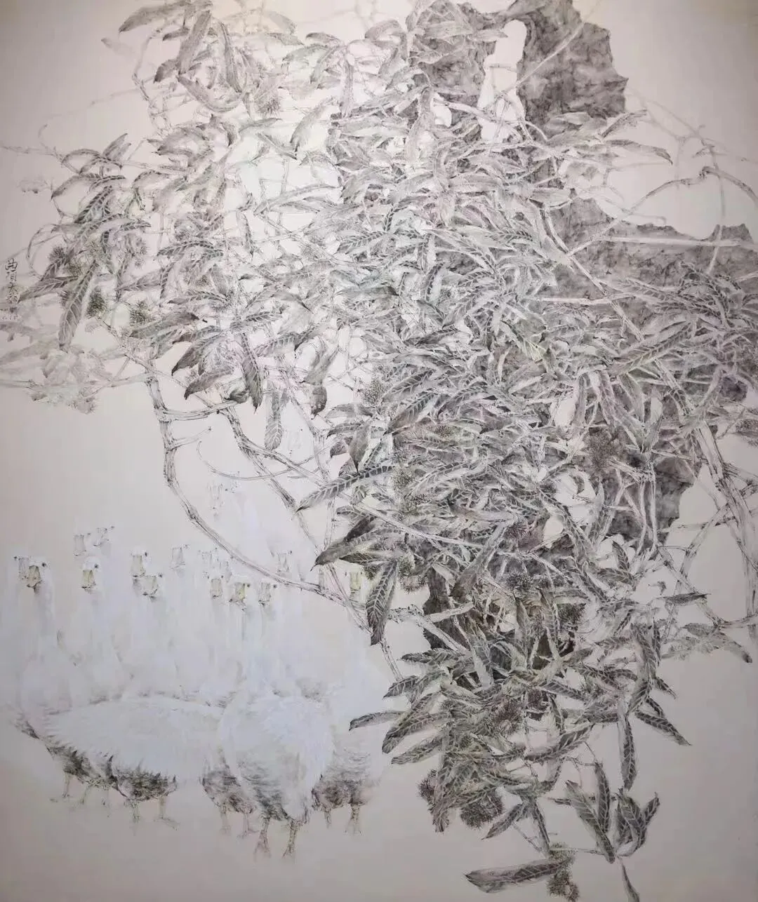 尺幅盲目求大。 为在开阔展厅中第一时间抓住评委眼球,创作者摒弃传统小品,动辄八尺、丈二甚至更大。画面追求满、密、繁,用大量细节填满画布,看似厚重,实则空洞,违背了留白造境、以小见大的传统美学。
