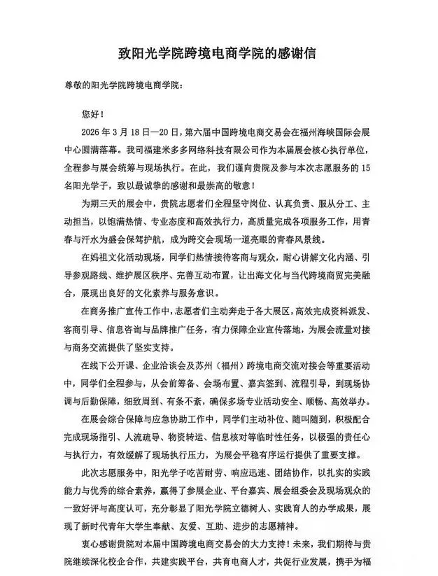 3月18日至20日,第六届中国跨境电商交易会在福州海峡国际会展中心盛大举行。在这场国际化、专业化、品牌化的行业盛会背后,阳光学院跨境电商学院15名志愿者默默坚守、倾情付出,用行动为盛会保驾护航。日前,中国跨境电商交易会组委会向学院发来感谢信,为阳光学子点赞!