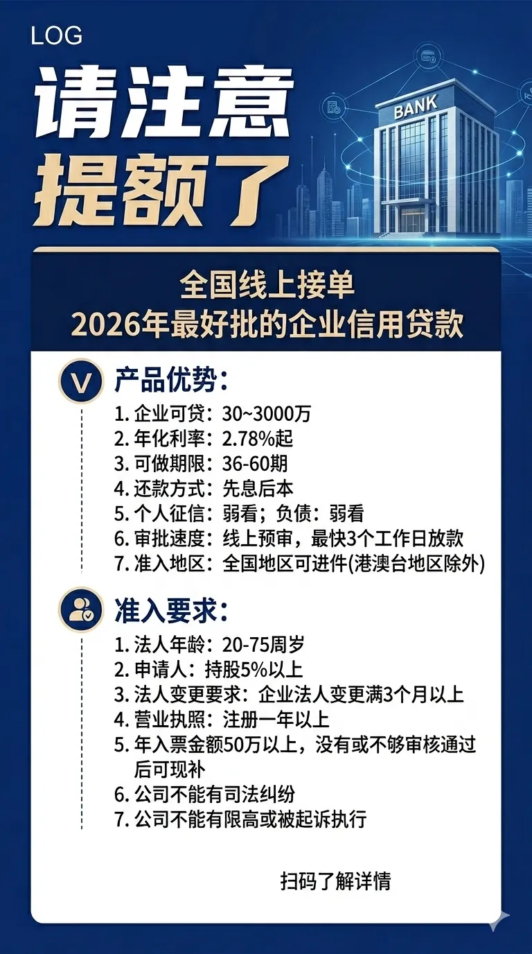 第三步,主动对接,精准咨询。建议扫下方二维码,结合企业的具体经营场景(如采购、发薪、扩产、研发)和资产情况(有无抵押物),咨询最适合的信用贷款产品。