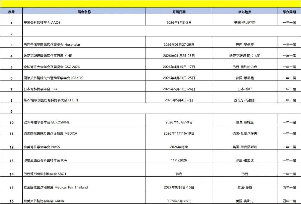 2026年全球骨科医疗展览计划表