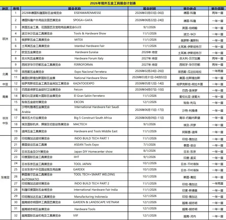 2026年全球五金工具展会计划表