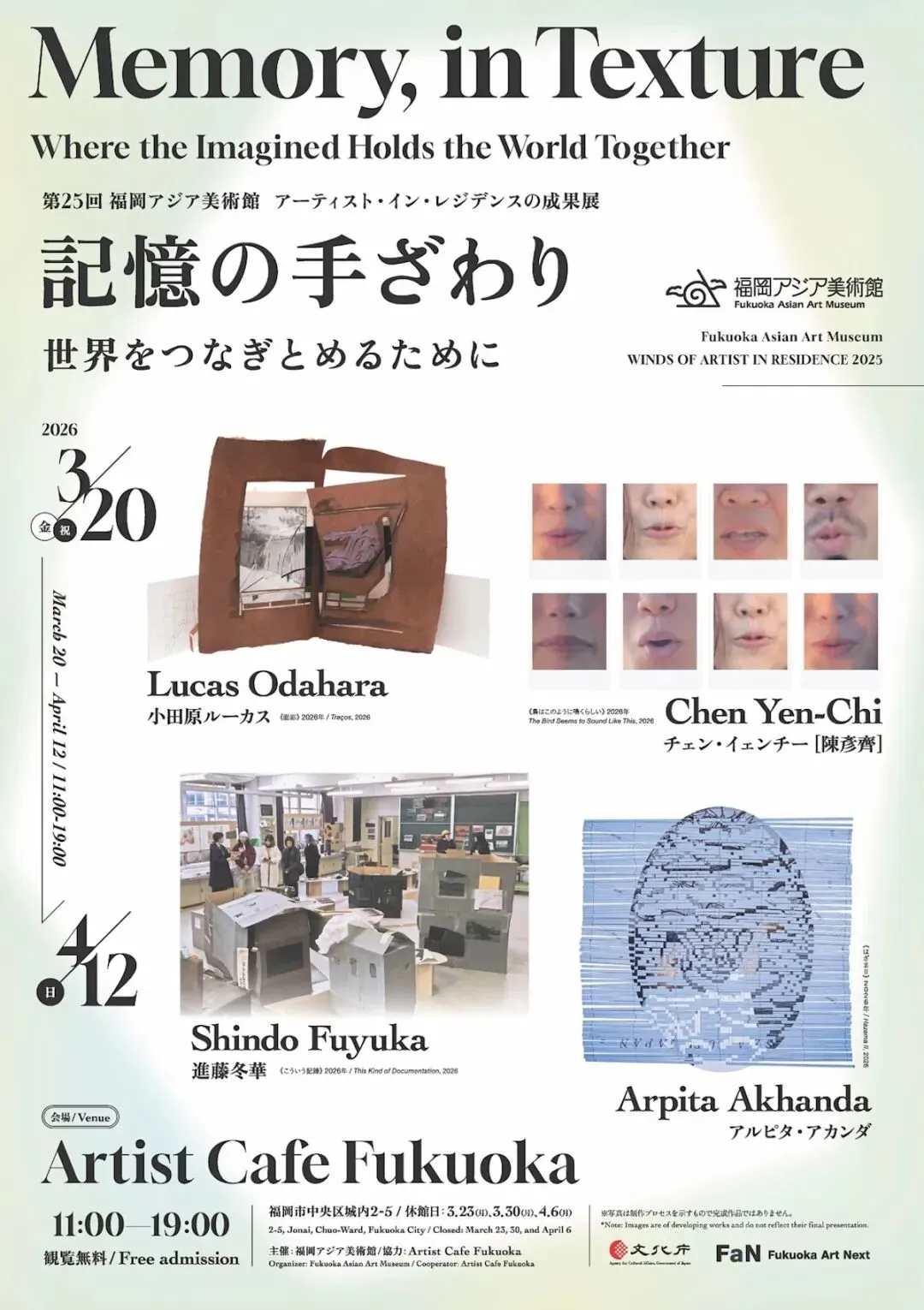 本展为福冈亚洲美术馆主办的艺术家驻留成果展,汇集了来自不同文化背景的四位艺术家——陈彦琪、进藤冬华、Arpita Akanda、小田原ルーカス在福冈驻留期间的创作成果。
