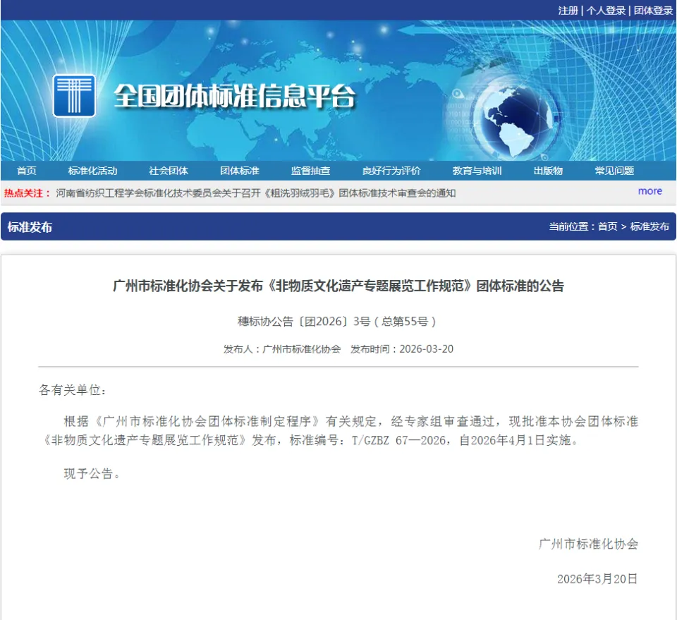 日前,由广州市文化馆(广州市非物质文化遗产保护中心)提出并牵头编制的团体标准《非物质文化遗产专题展览工作规范》正式发布,将于2026年4月1日起实施。