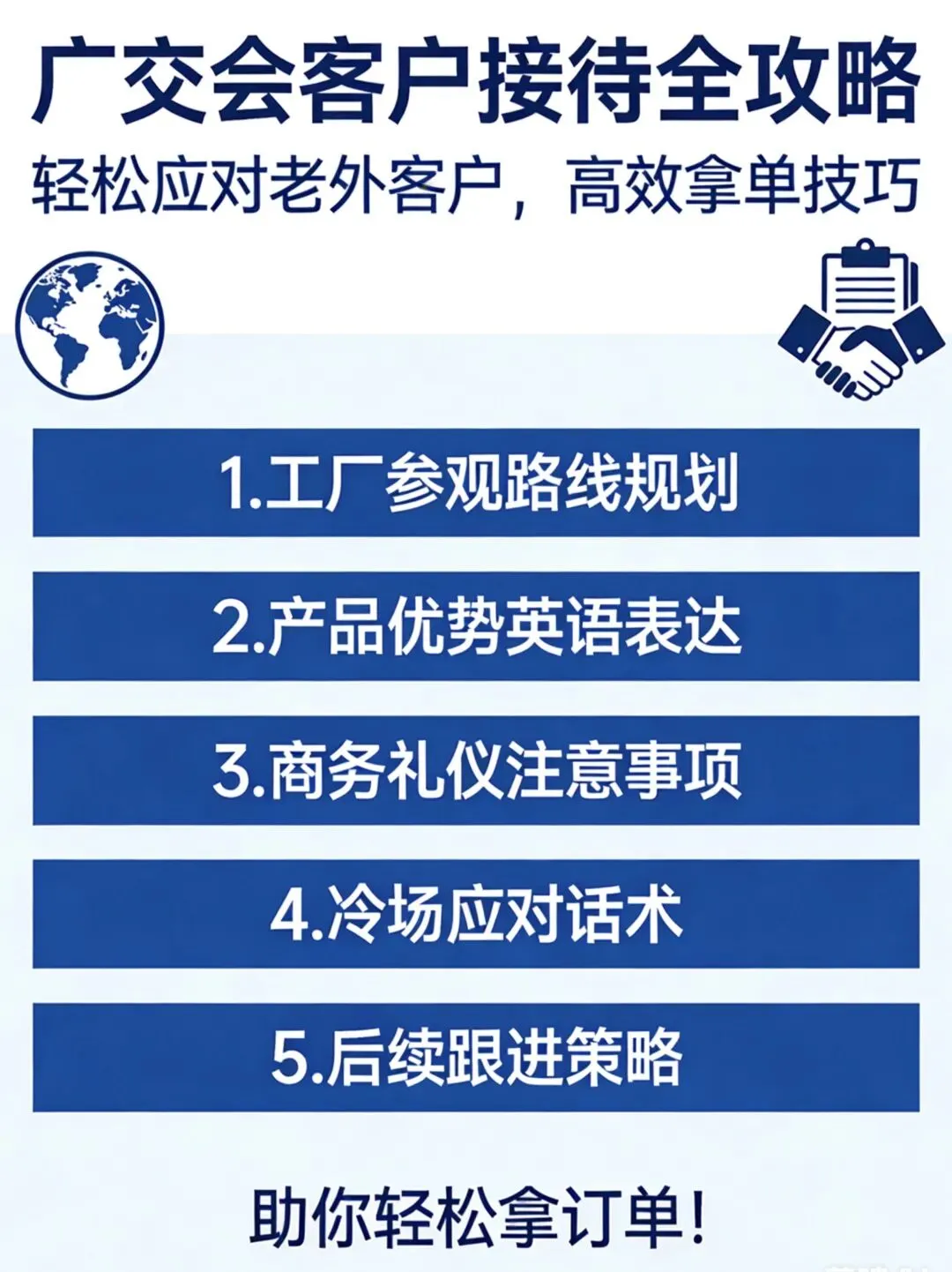 广交会即将到来,4月大批国外客户将来华参展。对外贸业务员来说,这不仅是展会交流产品的机会,更是借工厂参观展示专业、建立信任的好时机。可很多业务员因英语问题,介绍产品机械,交流后易冷场。别愁!本文提供完整接待老外客户攻略,助你轻松拿订单!