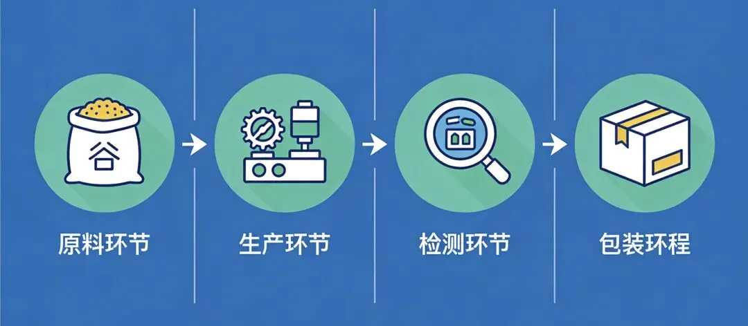• 简单介绍生产流程:原材料 → 生产 → 检测 → 包装