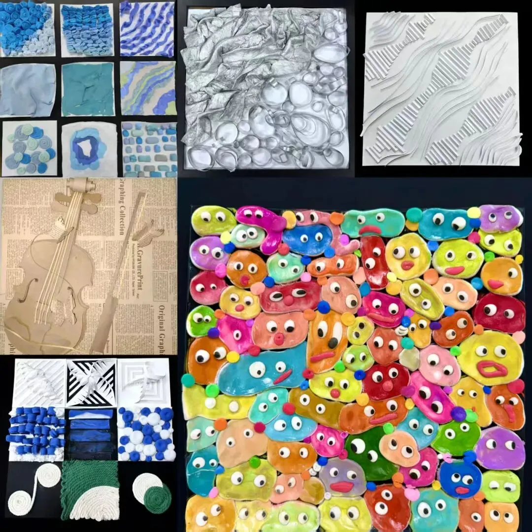 以丰富材料为载体,借由堆叠、塑形、编织等手法塑造出肌理与形态的碰撞,既有抽象波纹、几何秩序的理性之美,也有卡通形象、乐器造型的趣味表达,在光影与材质的对比中,展现了材料的可塑性与手工创作的温度,是形式美与创意表达的生动融合。学生姓名:刘雯雯、万艺茹、李明珠、甘紫艳、王诗涵、胡笑甜