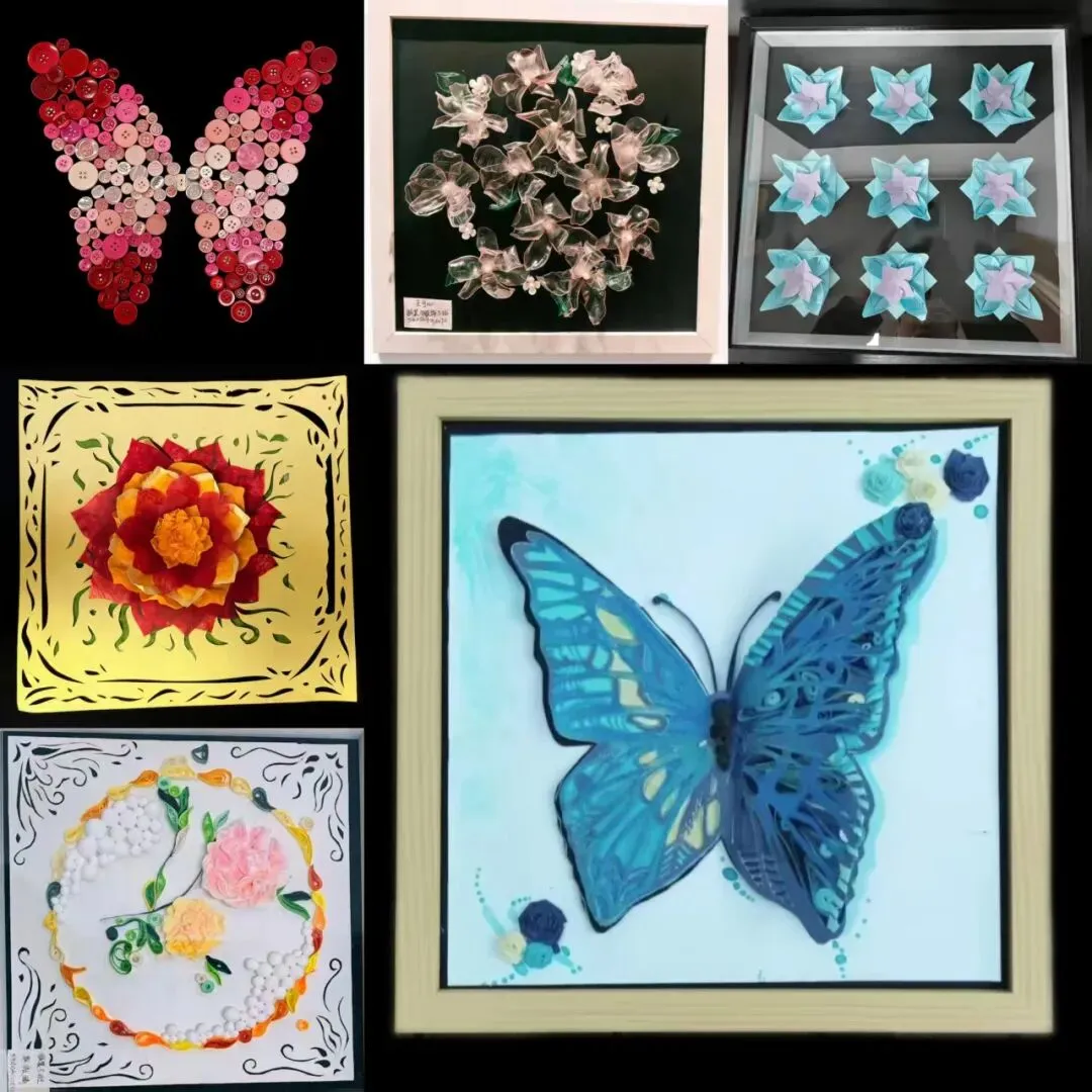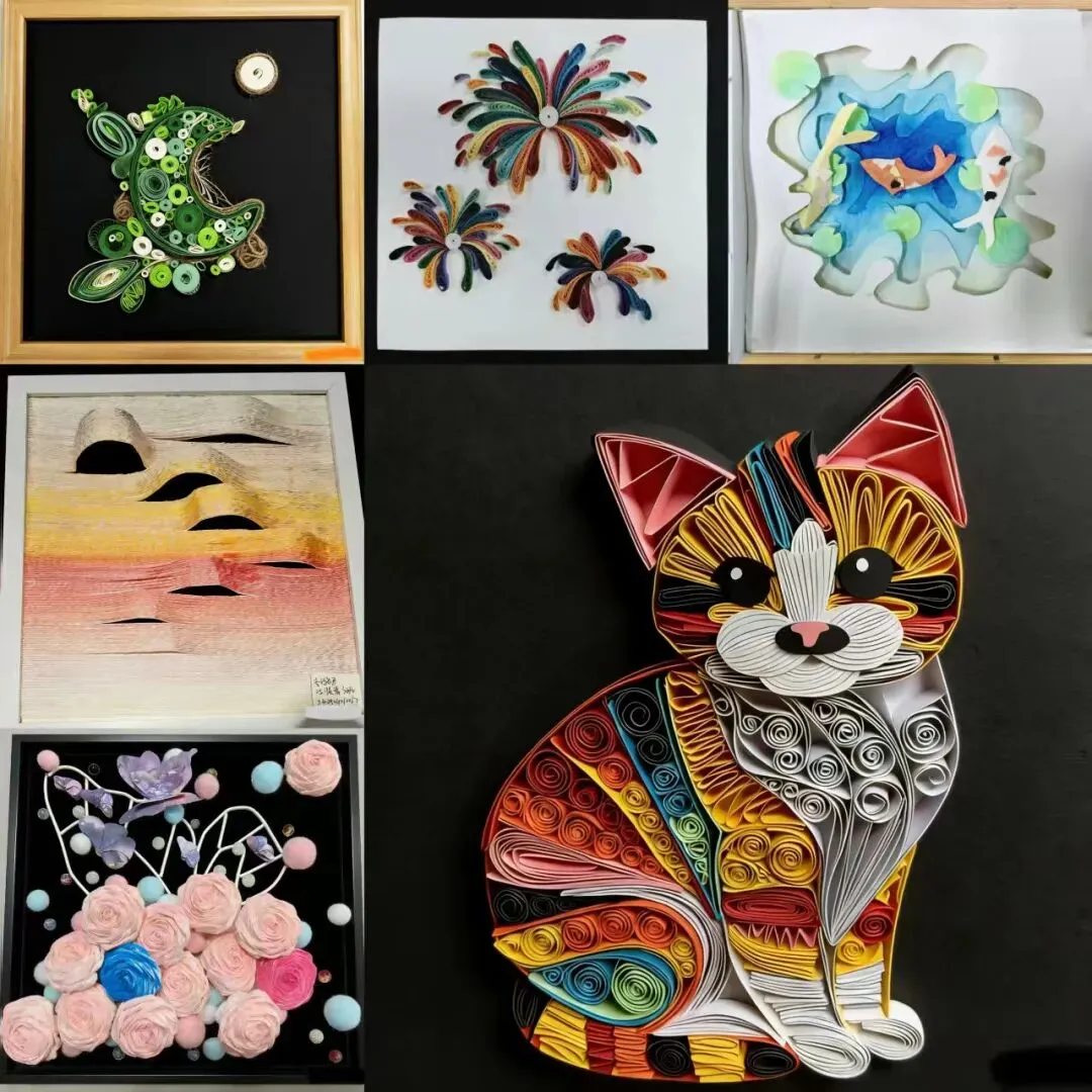 以纸为媒介,借衍纸、折叠等手工技法,将线条、色彩与形态巧妙融合,既有猫咪、花卉等具象形象的生动趣味,也有山水、烟火等意象的诗意表达,在光影与层次的变化中,展现了纸材的可塑性与手工艺术的细腻表现力,传递出生活美学的创意温度。学生姓名:袁欣雨、潘杏、雷珺仪、郝涵雪、王可心、李璐君以多元材料为载体,通过精巧的手工技法重构形态,既有纽扣拼贴的质朴趣味,也有衍纸与折纸的细腻层次,在色彩与肌理的碰撞中,将自然意象转化为富有韵律的装饰画面,展现了手工艺术的灵动与温度,传递出对生活美学的诗意表达。学生姓名:李育真、郑芮娇、王晨逸、刘家成、闫静雯、张静雯