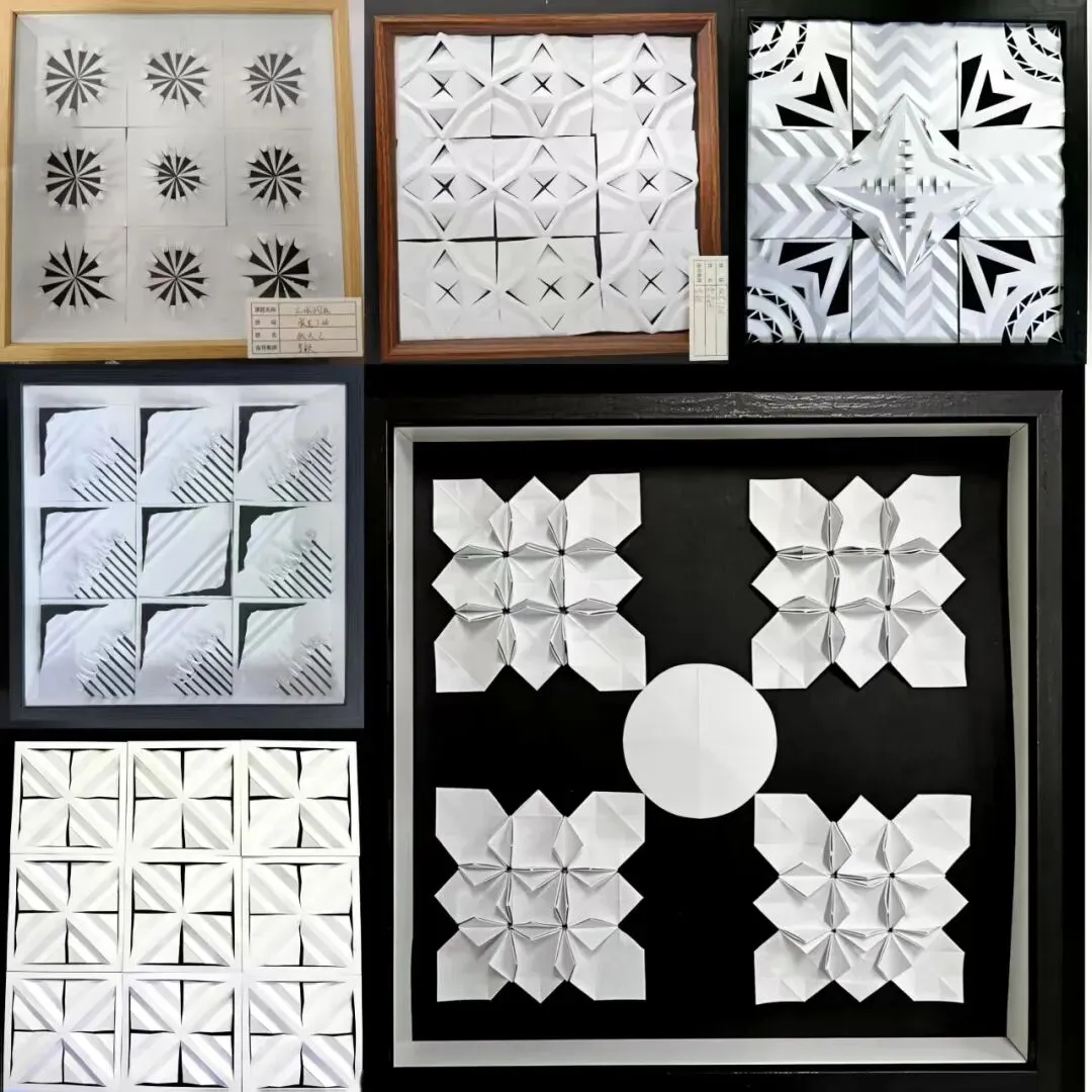 这些作品均为纸立体构成,以纸张为材料,通过折叠、切割、镂空等手法塑造形态,呈现出重复、渐变的几何秩序感,利用光影与凹凸变化营造视觉层次,属于平面向立体转化的构成设计,体现了形式美法则与手工纸艺的表现力。学生姓名:杨锡兰、耿春睿、宋佳豪、张舒然、肖雨