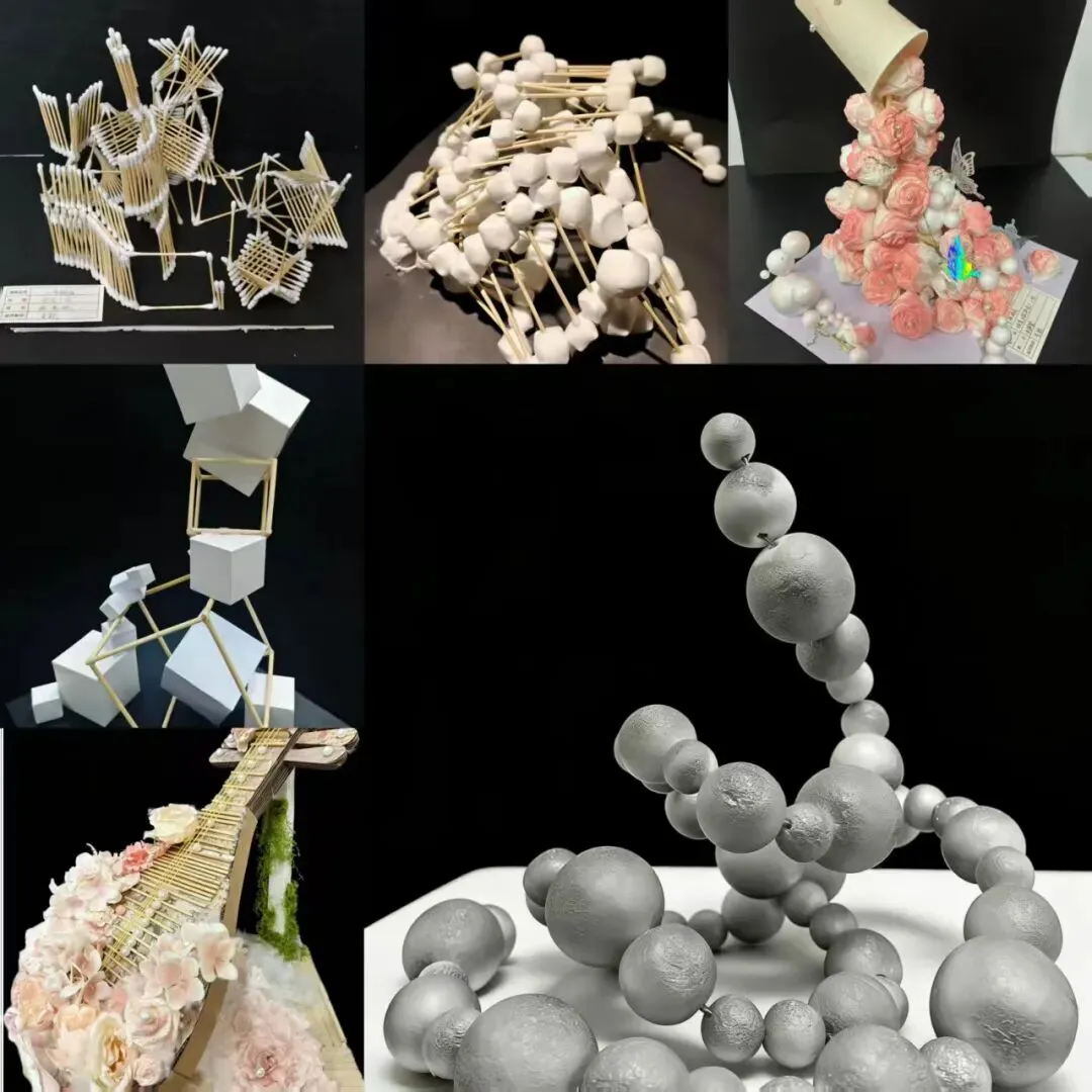 以多元材料为媒介,借由球体、线条、肌理的组合,在虚实之间构建出诗意的空间意象,既有纯净素雅的静谧感,也有灵动飘逸的梦幻感,通过材料质感的碰撞与光影的互动,展现了立体构成中形式美与材料表现力的高度融合,传递出空灵通透的艺术意境。学生姓名: 胡笑甜、王可心、常玉、张梦祥、徐伟、杨童舒以日常材料为创作载体,借由线条、块面、肌理的组合,在几何秩序与具象意象间自由切换,既有棉签与木架构建的结构张力,也有泡沫球与花卉塑造的柔美诗意,在材料质感的碰撞中,展现了立体构成的形式美感与手工创作的温度,传递出化平凡为艺术的创意巧思。学生姓名:刘家成、张诺、李明朔、李国清、蒋佳宏、何震坤