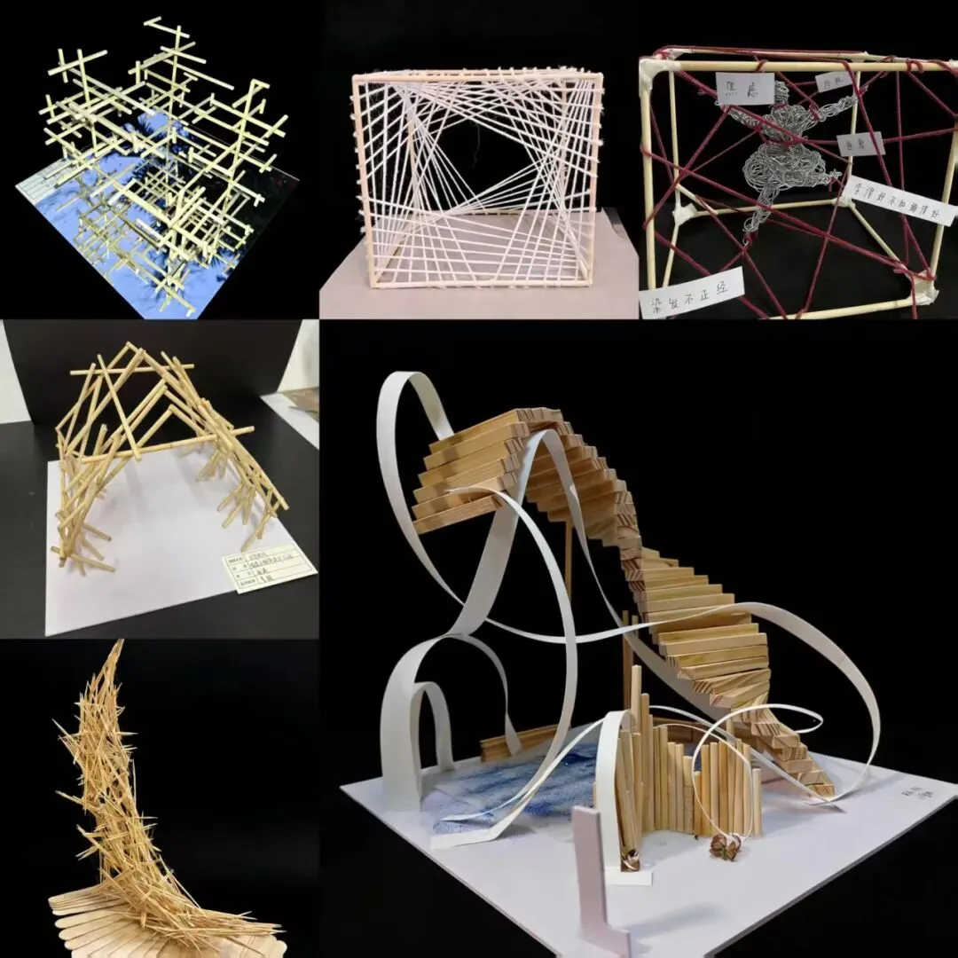 以管/条状材料为媒介,借由疏密、高低、色彩的变化,构建出城市、麦田、竹林等意象,在几何秩序与自然诗意间找到平衡,通过线条的韵律与材质的碰撞,展现了立体构成的形式美感与手工创作的创意温度,传递出对生活与自然的艺术化表达。学生姓名:穆姝伊、王诗涵、滑琪玥、吴礼蓉、闫静雯、潘杏