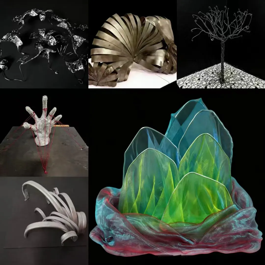 以多元材料为创作载体,借由线条、块面与肌理的碰撞,在刚与柔、虚与实的对比中构建出强烈的视觉张力,既有金属弯折的冷峻力量,也有纱网与黏土塑造的柔美诗意,在光影与材质的互动中,展现了立体构成的形式美感与手工创作的情感温度,传递出对生命与自然的艺术化表达。学生姓名:王林悦、祝涵钰、郑芮娇、宋佳豪、刘萌琦、袁欣雨