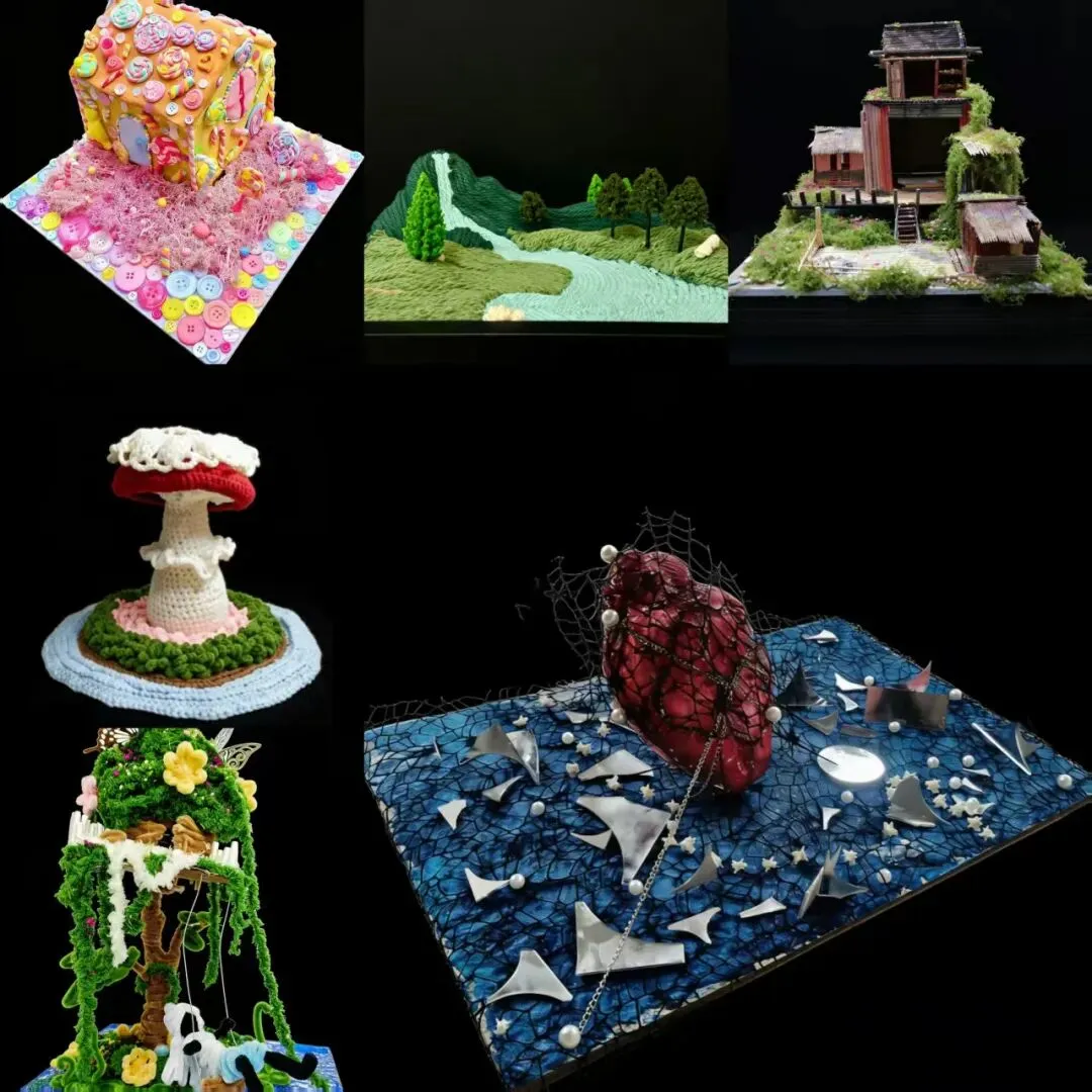 以丰富材料为载体,借由细腻的手工技法,将日常材料转化为糖果屋、山水、古建等具象场景,在微观尺度中营造出鲜活的视觉叙事,既有童趣的甜美氛围,也有自然与人文的诗意表达,在材质肌理与光影的碰撞中,展现了立体构成的创意张力与手工创作的温度。学生姓名:蔡加祥、郝涵雪、吴子豪、贾琳、林禹硕、刘子晨