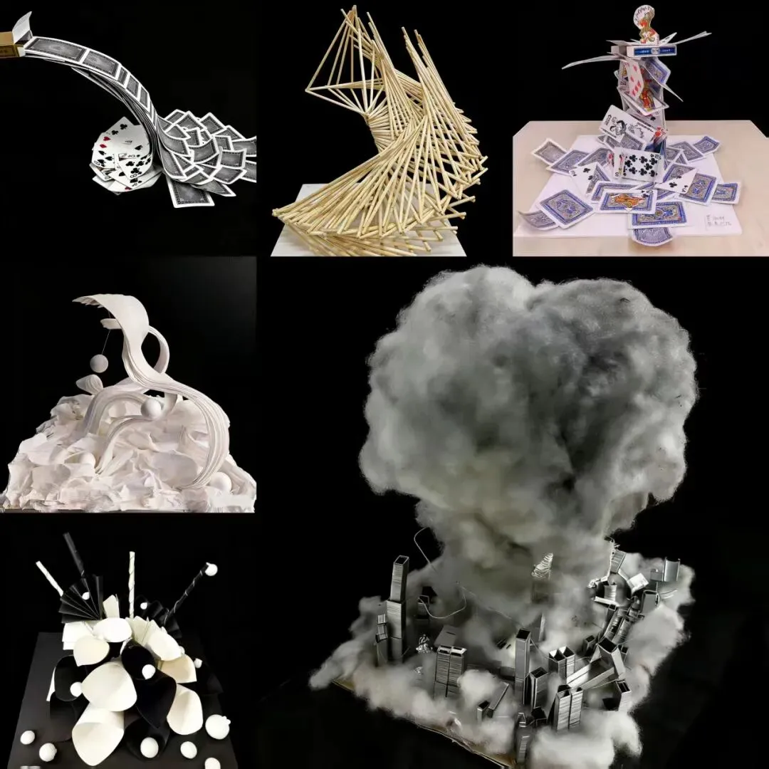 以丰富的日常材料为创作载体,借由线条、块面与肌理的碰撞,在虚实之间构建出强烈的视觉张力,既有扑克牌与竹签搭建的结构韵律,也有棉花与纸艺塑造的意象氛围,在材质对比与光影互动中,展现了立体构成的形式美感与手工创作的概念深度,传递出对消费、毁灭等主题的艺术化思考。